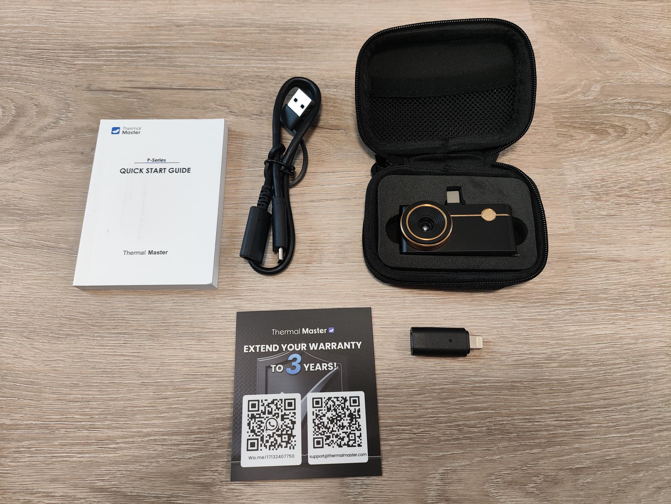 Die Thermal Master P3 wird mit einer praktischen kleinen Tragetasche geliefert. Somit ist die Kamera stets perfekt geschützt und kann in der Hosentasche verstaut werden. Neben der Garantiekarte und der Bedienungsanleitung legt der Hersteller auch noch ein USB-C-Verlängerungskabel, einen USB-C- auf USB-A-Adapter und einen USB-C- auf Lightning-Adapter bei.