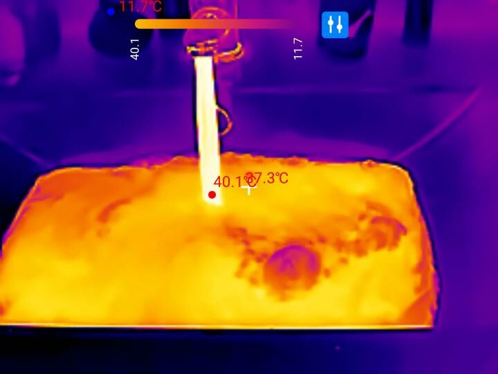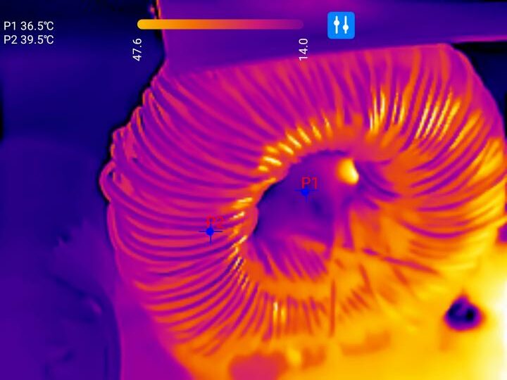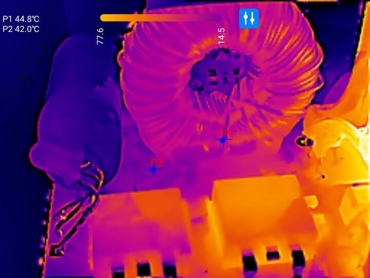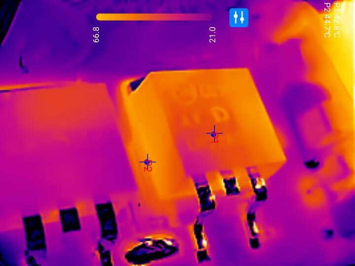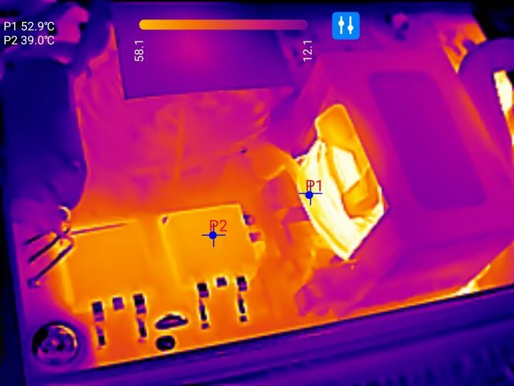 Auch wenn hier Wärmereflexionen der Metalloberflächen ein exaktes Ergebnis nahezu unmöglich machen, so sind die Temperaturverläufe dennoch beeindruckend akkurat dargestellt. Mithilfe der Thermal Master P3 lassen sich somit Kurzschlüsse oder Hotspots auf Leiterplatten vergleichsweise einfach aufspüren.