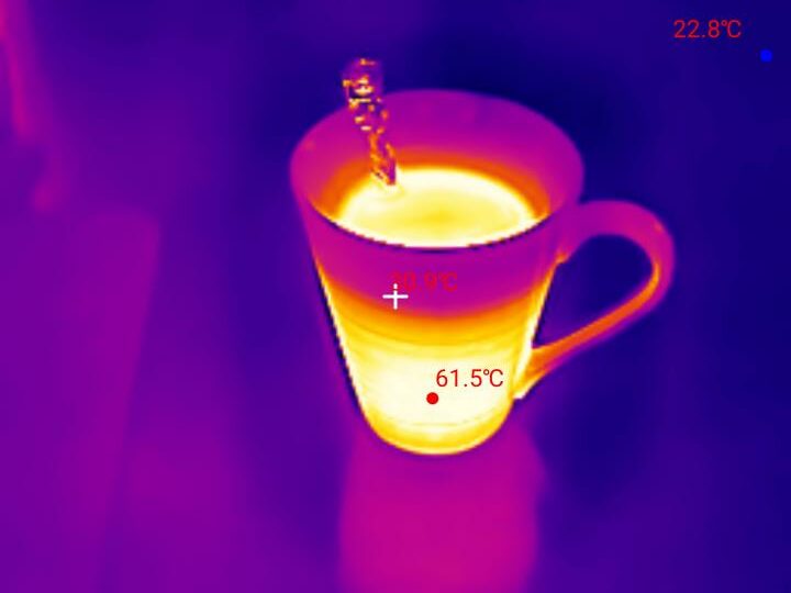 Wie bereits von der Thermal Master P2 bekannt, bietet euch die Kamerasoftware zahlreiche Möglichkeiten der Temperaturmessung. Ihr könnt beispielsweise Punktmessungen, Messungen anhand einer Linie, eines Vierecks oder Kreises durchführen, die ihr frei in eurem Thermografiebild positionieren könnt. In den jeweiligen Messobjekten werden euch automatisch die minimale, maximale und die Durchschnittstemperatur angezeigt. Mittels der 15x-Zoom-Funktion könnt ihr Bildausschnitte unter Einbußen der Bildqualität vergrößern und gezielt bestimmte Bereiche auswerten. Die Anpassung der Bildparameter (Helligkeit, Kontrast) konnten wir im Test nicht sinnvoll einsetzen. Für 99% der Anwendungsfälle sind die Standardparameter passend. Die optionale Isotherme-Skala zeigt euch den Temperaturverlauf zu einer festgelegten Farbskala. Somit könnt ihr schon ohne genaue Punktmessung abschätzen, wie warm bestimmte Bereiche sind.