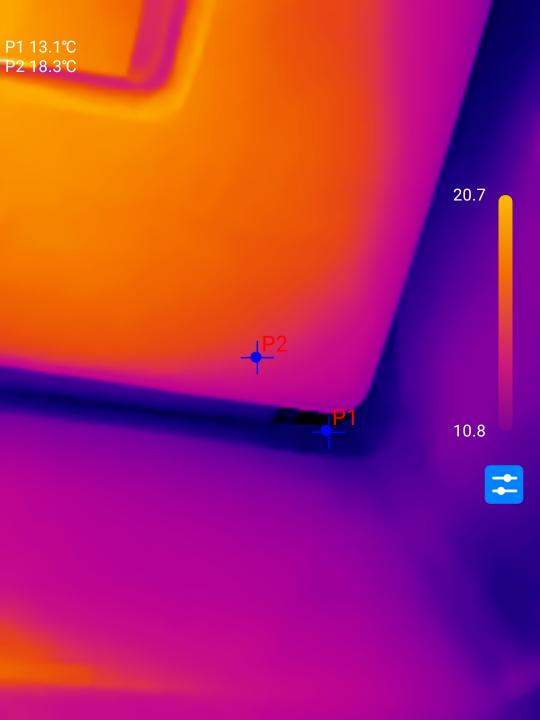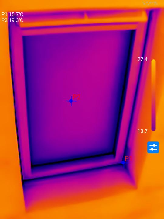Die Thermografieaufnahmen und die Temperaturempfindlichkeit haben sich im Vergleich zur Thermal Master P2 weiter verbessert. Selbst minimale Temperaturunterschiede von weniger als 1°C sind klar zu erkennen. Am Beispiel dieses Velux-Dachfensters könnt ihr erkennen, dass der eigentliche Fensterrahmen in Bezug zur umliegenden Dämmung rundherum zu viel Wärme verliert.