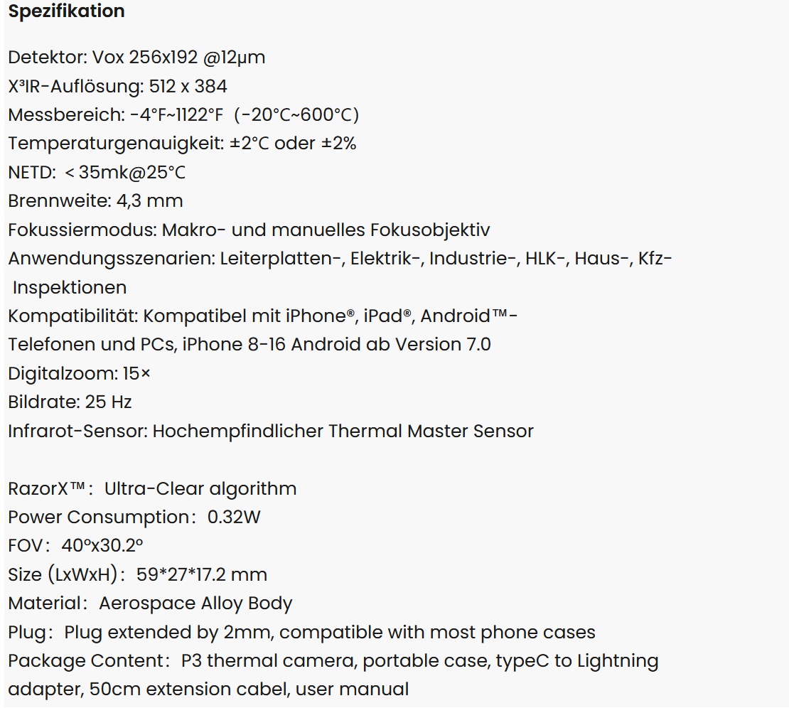 Technische Daten der Thermal Master P3