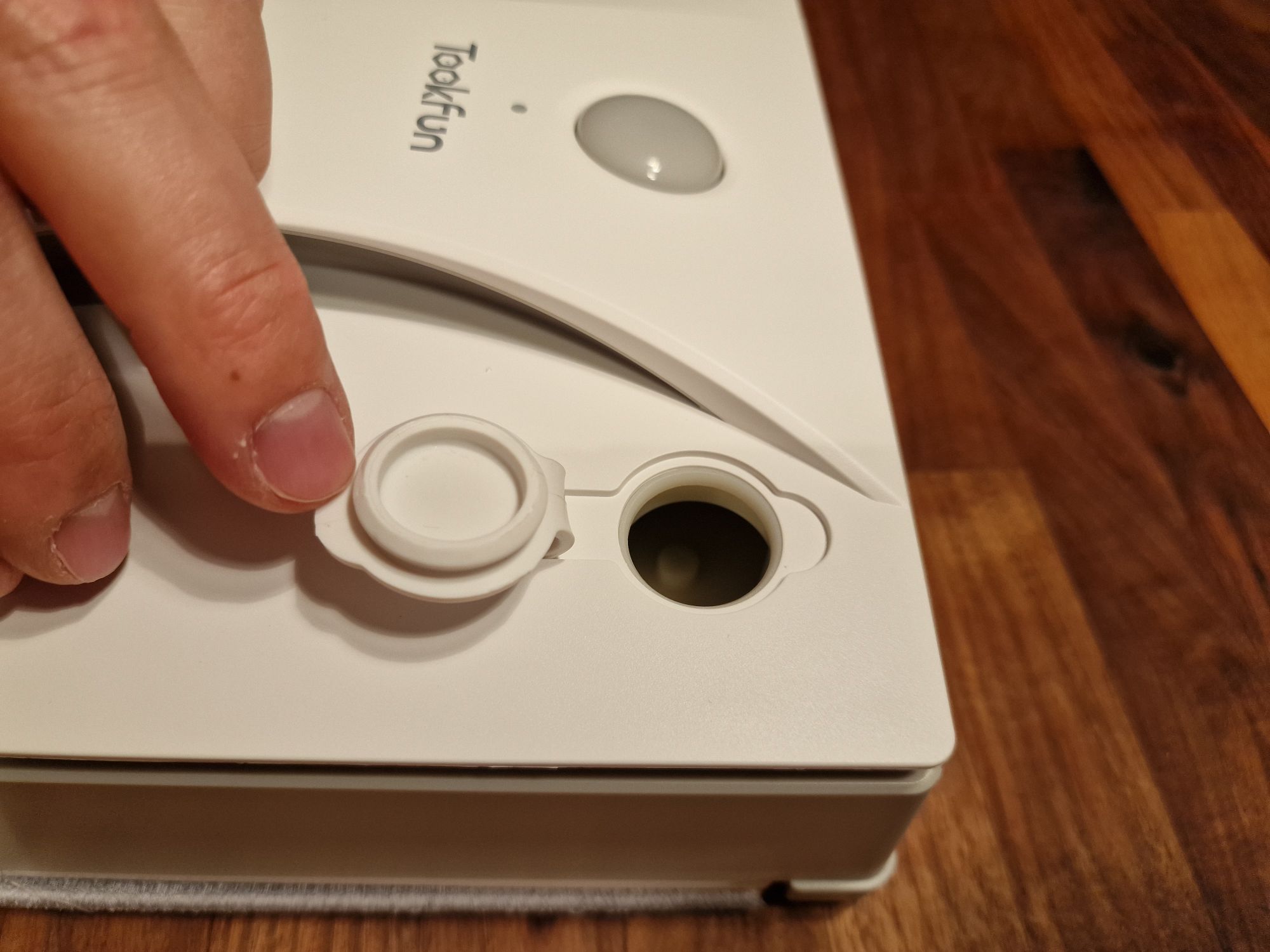 Leider befindet sich der Power-Schieberiegel, womit sich das Gerät ein- und ausschalten lässt, auf der Unterseite. Ich würde diesen Schieber lieber auf der Seite oder oben am TookFun W1 haben, da man so kaum drankommt und das Gerät von der Scheibe nehmen muss, um es zu deaktivieren. Neben diesem Schieber ist noch eine Gummikappe verbaut, unter welcher ein USB-Anschluss steckt. Dieser ist für Updates gedacht.