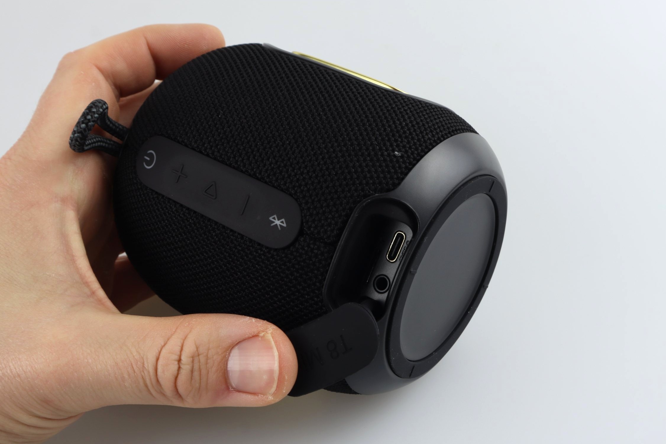 Eine kleine Stofflasche ermöglicht es, den T8 Mini an verschiedenen Dingen zu befestigen, während sich unter einer dicken Gummidichtung neben einem USB-C-Anschluss auch ein 3,5mm-Klinkenanschluss und ein SD-Karten-Schacht befinden. Warum Hersteller bei modernen Speakern noch auf diese alten Anschlussarten setzen, bleibt unklar, doch Alternativen und Optionen sind stets erfreulich. In diesem Fall wird der USB-C-Anschluss nicht nur zum Laden, sondern auch zur Datenübertragung verwendet. Dank der Gummidichtung ist der T8 Mini nach IPX7 wasserdicht.