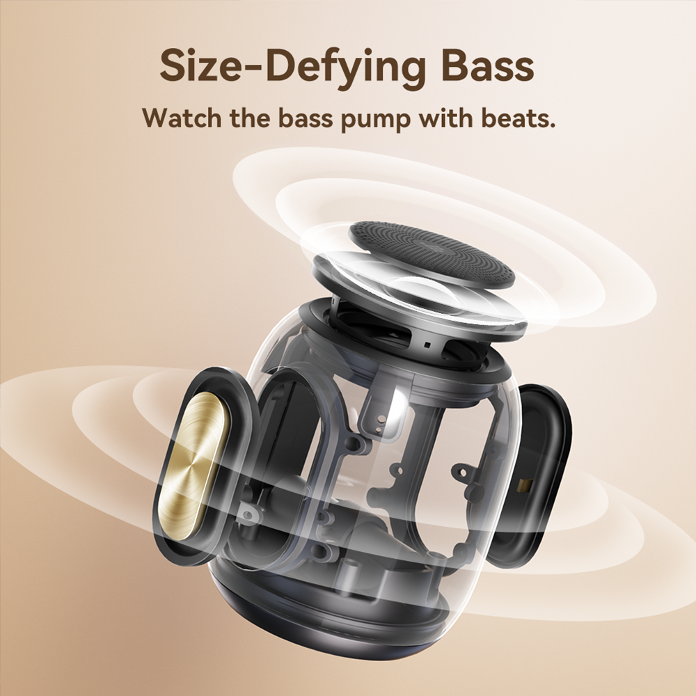 Besonders der hier getestete T8 Mini hat sich im Vergleich zum T7 verändert. Der eigentliche Speaker sitzt nun nicht mehr seitlich im Gehäuse, sondern strahlt nach oben ab, geschützt von einem dicken Alugitter. An den Seiten verbaute der Hersteller stattdessen zwei Passivstrahler, die für die Größe des Minis riesig wirken. Mit der Neuausrichtung des Treibers ist auch das Bedienfeld an die Seite gewandert, da oben kein Platz mehr vorhanden ist. Dafür wurde um den Lautsprecher ein LED-Ring integriert, der Tronsmart-typisch in verschiedenen Leuchtmodi betrieben werden kann.