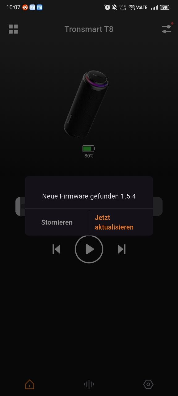 Bei der App gibt es gegenüber dem T8 Mini keine Änderungen oder Erweiterungen. Die Anwendung bietet drei Seiten: eine grobe Übersicht mit Akkustand und Mediensteuerung, die Seite für die Soundprofile mit eigens einstellbarem Equalizer sowie eine Seite, um die Eingänge direkt anzusteuern, die LED-Anzeige anzupassen oder das Gerät auszuschalten. Über die erweiterten Einstellungen könnt ihr außerdem Firmware-Updates durchführen, einen Abschalttimer setzen oder den Stereo-Modus für zwei gleiche Lautsprecher aktivieren. Im Testzeitraum stand sogar ein Update zur Fehlerbehebung an. Die App ist in Ordnung; ihr dürft keine Wunder erwarten, aber immerhin ist eine Integration vorhanden.