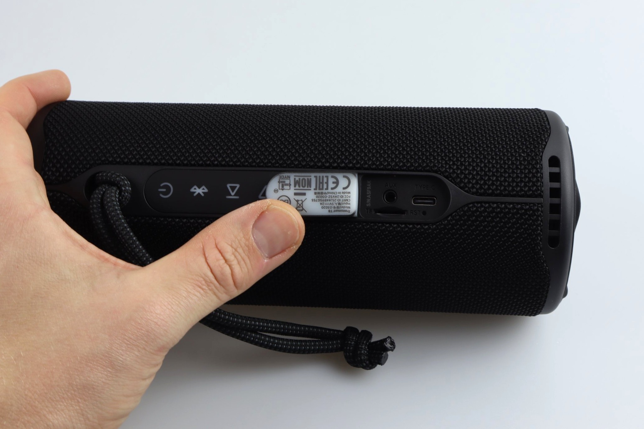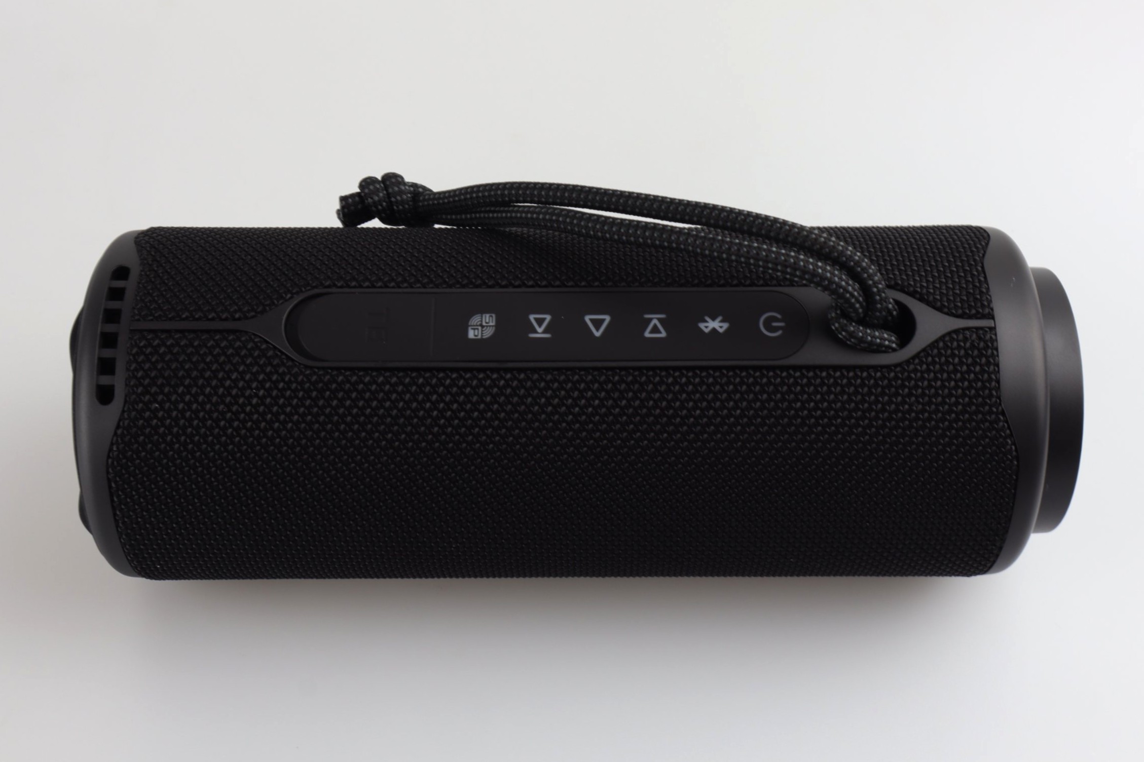 Durch den Namensvetter könntet ihr meinen, Tronsmarts T8 wäre nur eine große Version des Mini. Aber das stimmt nicht ganz. Einige Designelemente sind wiederum ähnlich. So liegen auch bei dem T8 die Knöpfe an der Seite und nicht mehr oben. Durch das größere Platzangebot hat sich Tronsmart dafür entschieden, die Anschlüsse direkt unterhalb der Knöpfe zu verbauen. Versteckt unter einer Gummilasche befinden sich hier ein USB-C-Anschluss, ein SD-Karten-Schacht und ein 3,5mm-Klinkenanschluss (AUX). Über dem Bedienfeld kann eine Trageschlaufe angebracht werden. Bereits ab Werk ist eine farblich passende befestigt.