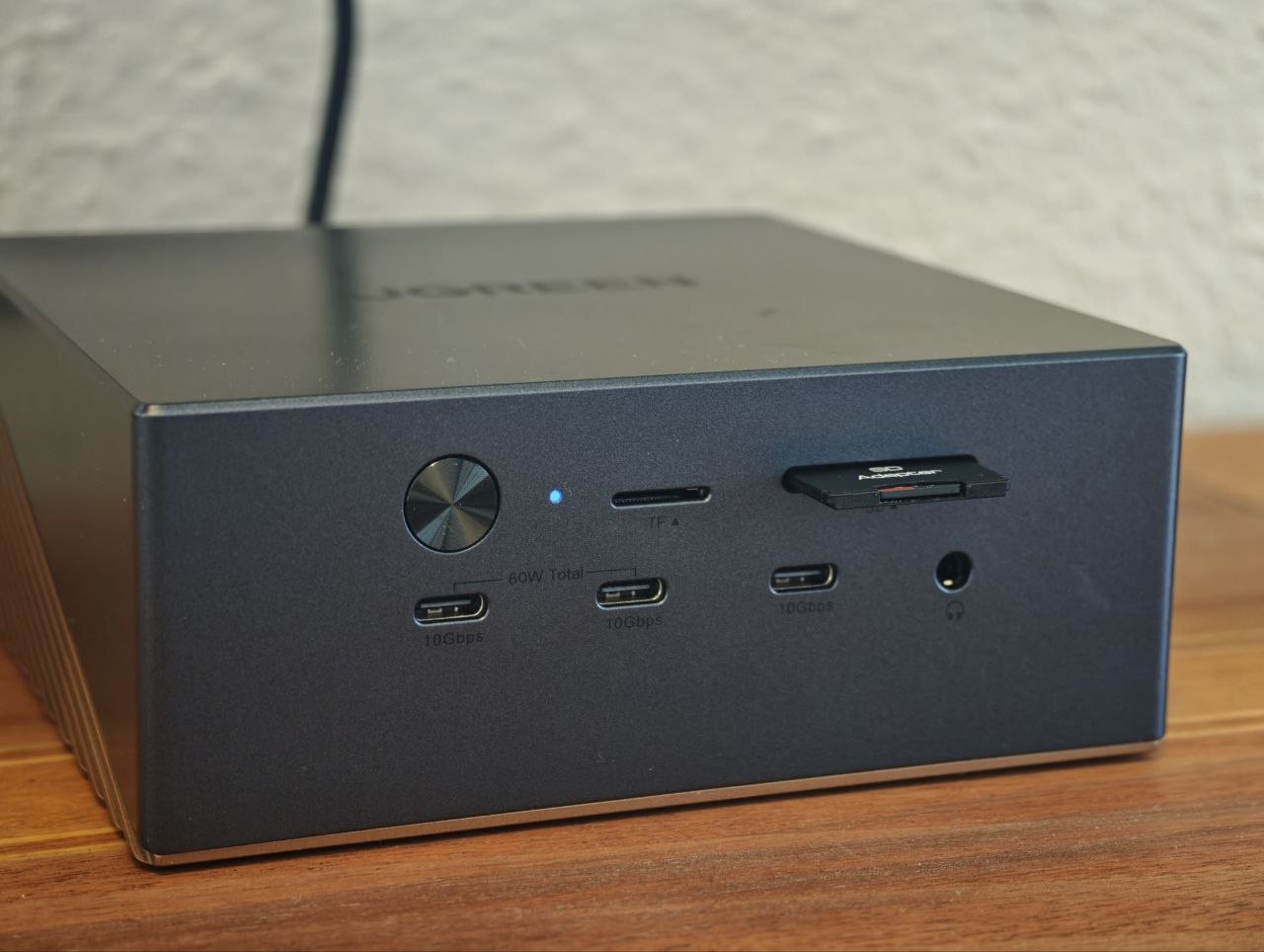 Auch abseits des SSD-Slots liefert das Dock im Alltag genau das, was ihr von einem modernen High-End-Dock erwartet. Die USB-Ports mit 10Gbit/s reichen für schnelle USB-Sticks, Audio-Interfaces und andere Peripherie locker aus. Positiv fällt auf, dass Ugreen vorne gleich drei USB-C-Ports platziert. Das ist im Alltag äußerst praktisch.