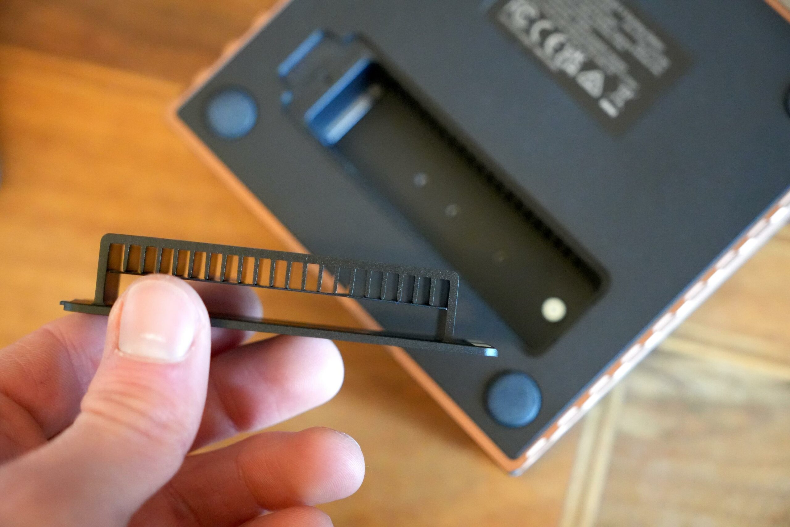 Das Gehäuse besteht aus Metall und macht einen sehr hochwertigen Eindruck. Die dunkle Farbgebung in Kombination mit den kupferfarbenen Lüftungselementen sorgt dafür, dass das Dock etwas eigenständiger aussieht als die üblichen grauen Aluminiumkästen. Die Verarbeitung ist insgesamt auf einem sehr hohen Niveau. Das Gerät wirkt massiv, steht sicher auf dem Tisch und vermittelt direkt einen Premium-Eindruck.
