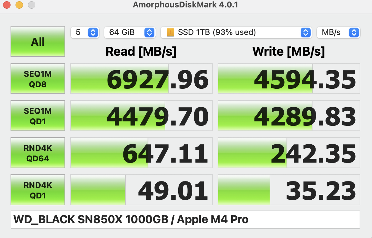 Noch wichtiger ist aber die Geschwindigkeit. Hier liefert das Dock im Benchmark ab. Mit der WD_BLACK SN850X 1TB erreichen wir im AmorphousDiskMark 6.927MB/s im Lesen und 4.594MB/s im Schreiben. Anzumerken ist zudem, dass wir diesen Test mit einer 64GB-Testdatei durchgeführt haben, um auch die Leistung unter Dauerlast zu testen. Auch das stellte die Maxidok-Dockingstation vor kein Problem.
