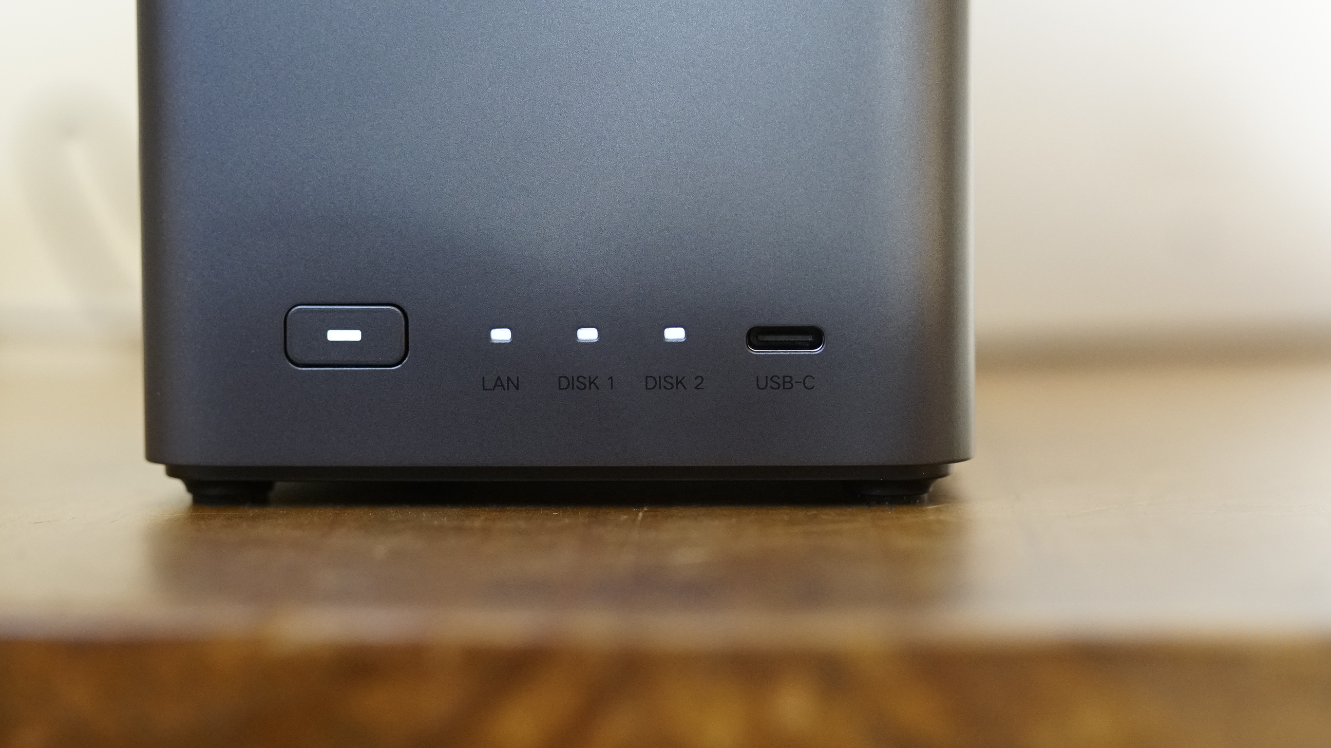Auf der Vorderseite befindet sich je eine Status-LED pro Einschub. Außerdem ist dort ein USB-C-Anschluss verbaut. Zweimal USB-A (USB 3.2 Gen 1, 5 Gbit/s), einmal HDMI mit Support für 4K/60, ein Gigabit LAN-Anschluss und der Stromanschluss befinden sich auf der Rückseite. Vorne am NAS ist zudem eine NFC-Kontaktfläche für die Ersteinrichtung verbaut.