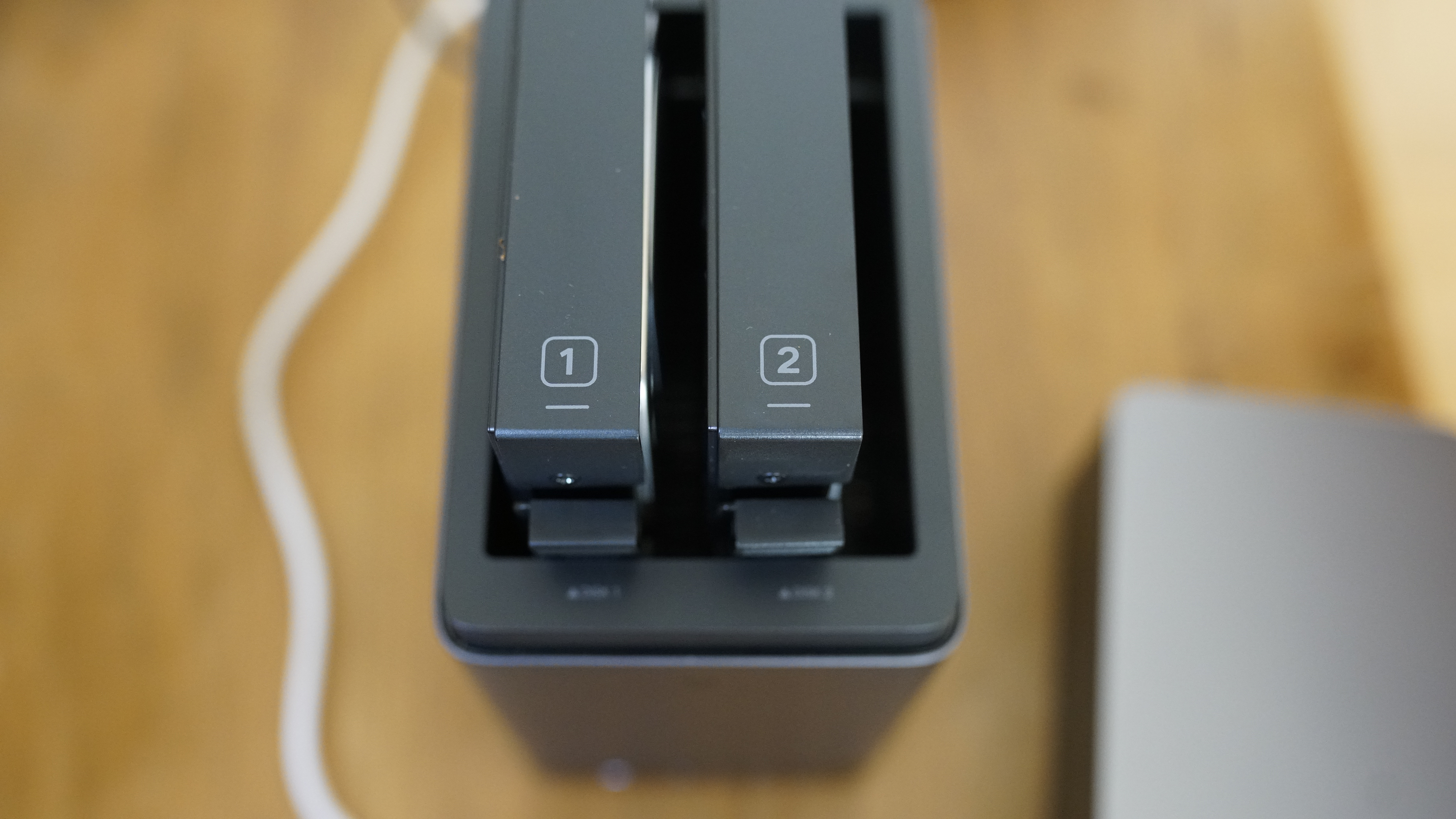 Die Abmessungen des Ugreen NASync DH2300 liegen bei 151 x 98 x 213 Millimeter. Mit dem Terra-Master F2-221 (zum Test) verglichen, den ich ebenfalls im Einsatz habe, fällt das niedrigere Gewicht sofort auf. Das liegt an den zweckmäßigen Materialien beim NAS von Ugreen. Unter dem Deckel auf der Oberseite, der magnetisch festgehalten wird und aus Plastik besteht, befinden sich die beiden Einschübe. Die Verarbeitung ist insgesamt sehr gut und der Ein-/Ausschalter hat einen guten Druckpunkt.