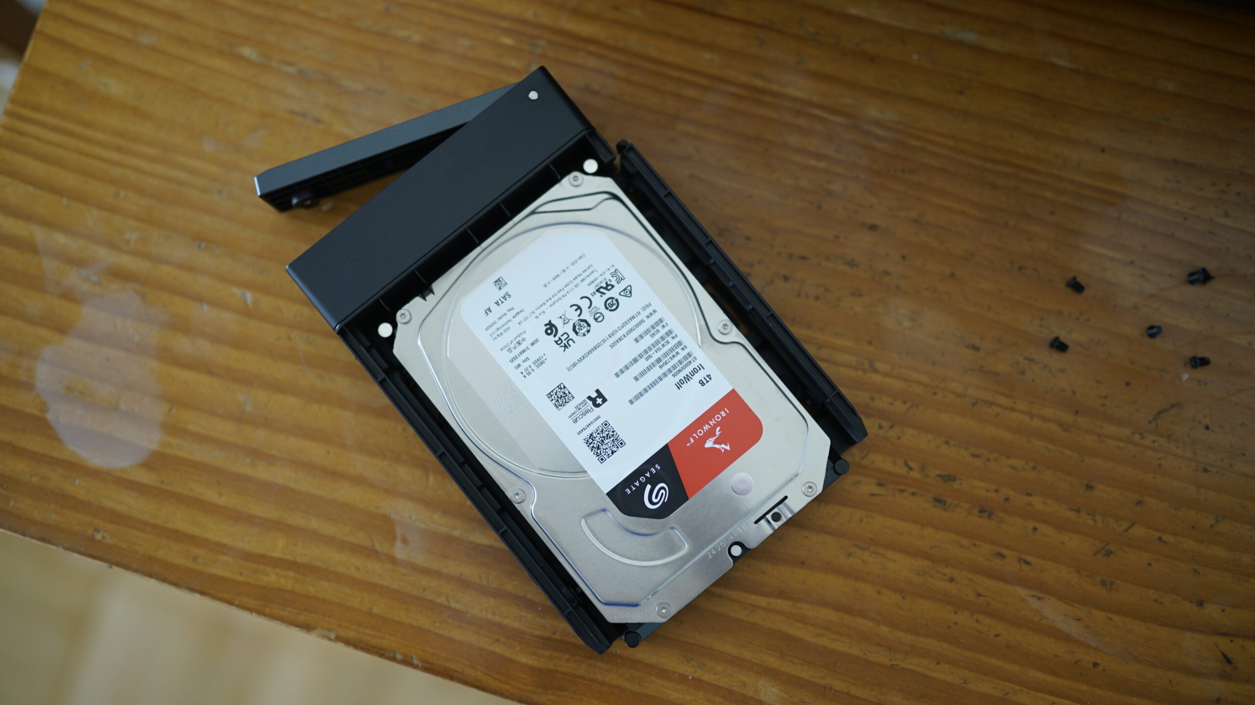 Die HDD-Einschübe auf der Vorderseite können ganz einfach herausgenommen werden und auch das Einlegen der Festplatten ist hier besonders intuitiv gelöst. Für HDDs mit 3,5 Zoll benötigt ihr nicht einmal einen Schraubendreher. Ihr legt einfach die Festplatte in den Schlitten, führt die dafür vorgesehene Mechanik zusammen, die dann hörbar einrastet, und das war es auch schon. Zehn Sekunden pro Festplatte dauert das ungefähr.