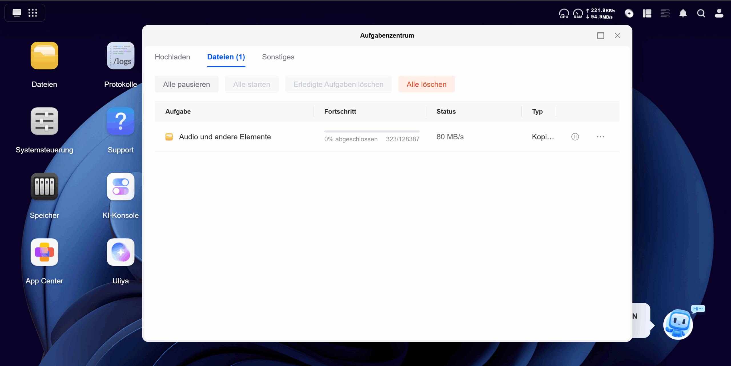 Im letzten Schritt habe ich meine Daten vom TerraMaster F2-221 (zum Test) auf den Ugreen iDX6011 Pro kopiert. Glücklicherweise könnt ihr in der Web-Oberfläche von UGOS Pro ganz einfach ein Netzwerklaufwerk hinzufügen, sodass sich der iDX6011 Pro die knapp 10TB von dem TerraMaster-NAS selbstständig ziehen konnte, ohne dass mein PC an sein musste. Die Übertragungsgeschwindigkeit lag, begrenzt durch meinen Router und den TerraMaster-NAS, dauerhaft bei genau 1Gbit/s. Der iDX6011 Pro langweilt sich dabei nur.