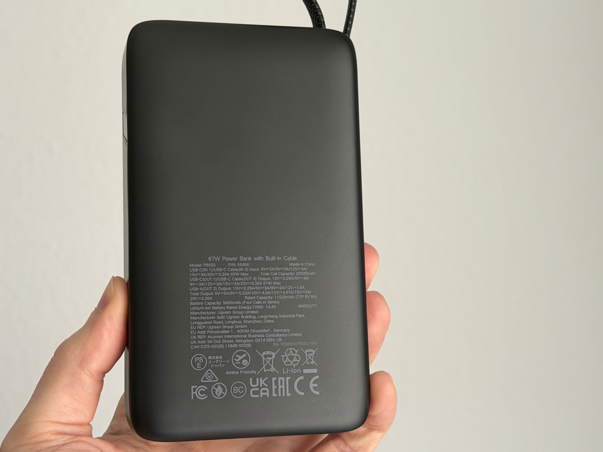 Mit Abmessungen von 13,91 x 8,02 x 2,71 Zentimetern sowie einem Gewicht von 386 Gramm gehört die Ugreen 67W Powerbank zu den kompakteren und leichteren ihrer Leistungsklasse.