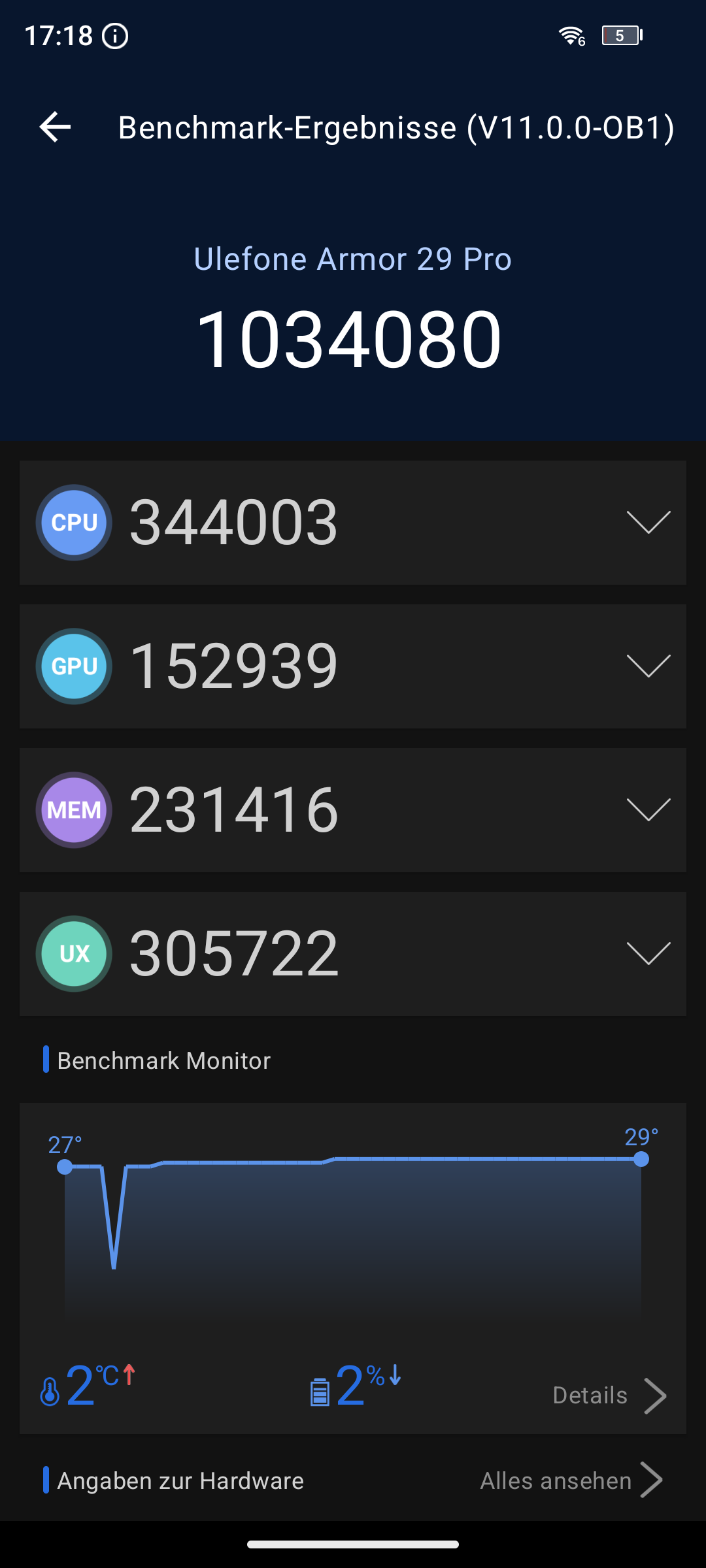 Im Armor 29 Pro Thermal kommt ein riesiger 21.200mAh Akku zum Einsatz (10.600mAh Kapazität bei 7,74V). Leider ließ sich das Benchmark nicht durchführen, da es entweder zufällig nach einer gewissen Laufzeit einfach abbrach oder die App sich mit einem schwarzen Bild verabschiedete. In der Realität kommt man aber 5 bis 7 Tage aus, bevor man das Gerät wieder an das Netzteil hängen muss. Eine Stunde YouTube kostet 1% Akku bei 120Hz und 200 Lux.