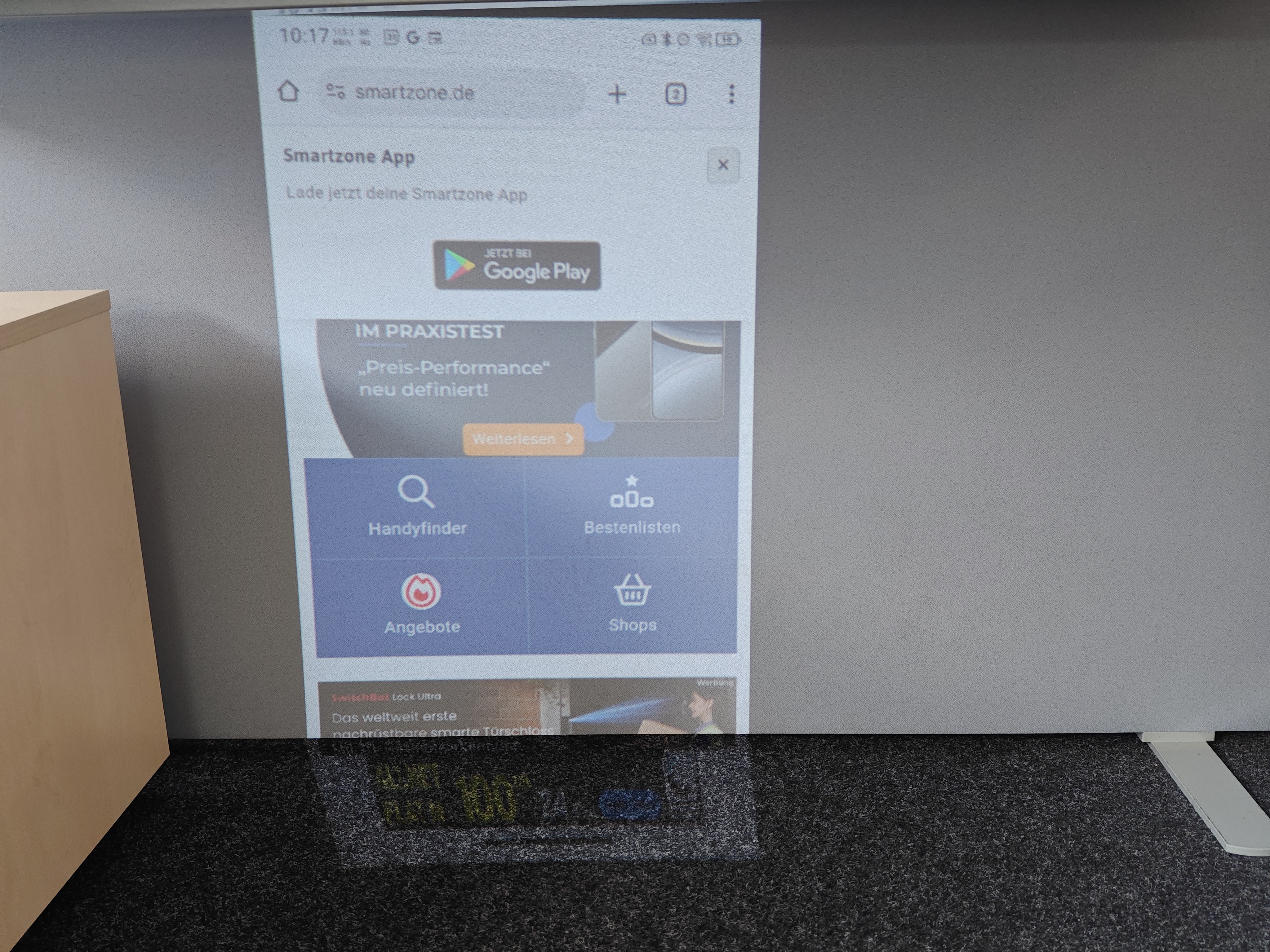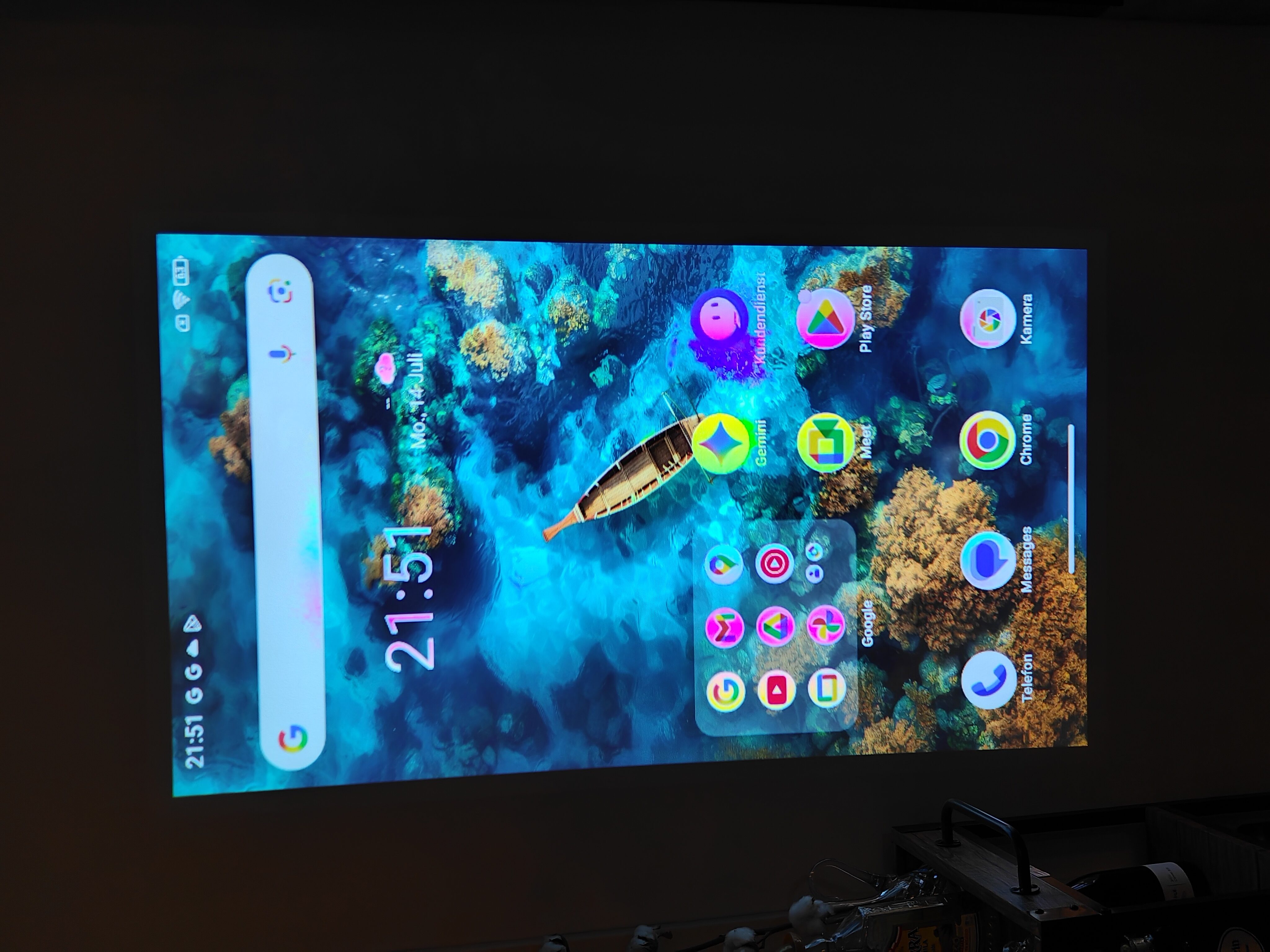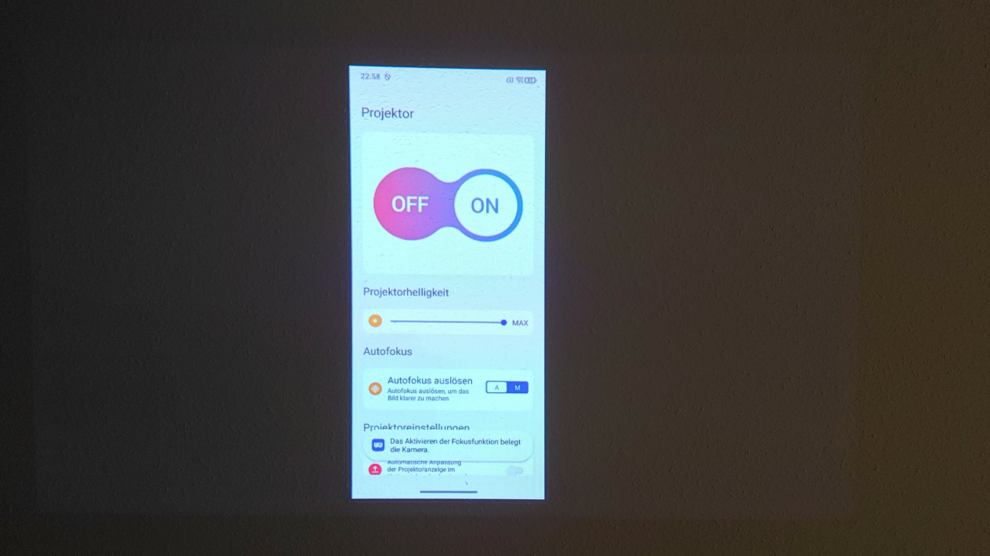 Der Beamer wird also nicht als zweiter Monitor behandelt, sondern spiegelt das Displaybild des Smartphones. In dem Menü zum Beamer lassen sich verschiedene Einstellungen treffen, wie das automatische Drehen der Anzeige und auch das automatische Fokussieren, was ganz gut funktioniert. Gelegentlich musste ich aber zwei, drei Fokusversuche starten. Überragend funktioniert die automatische Keystone-Korrektur, also die Anpassung von schrägen Winkeln zur Projektionsfläche.