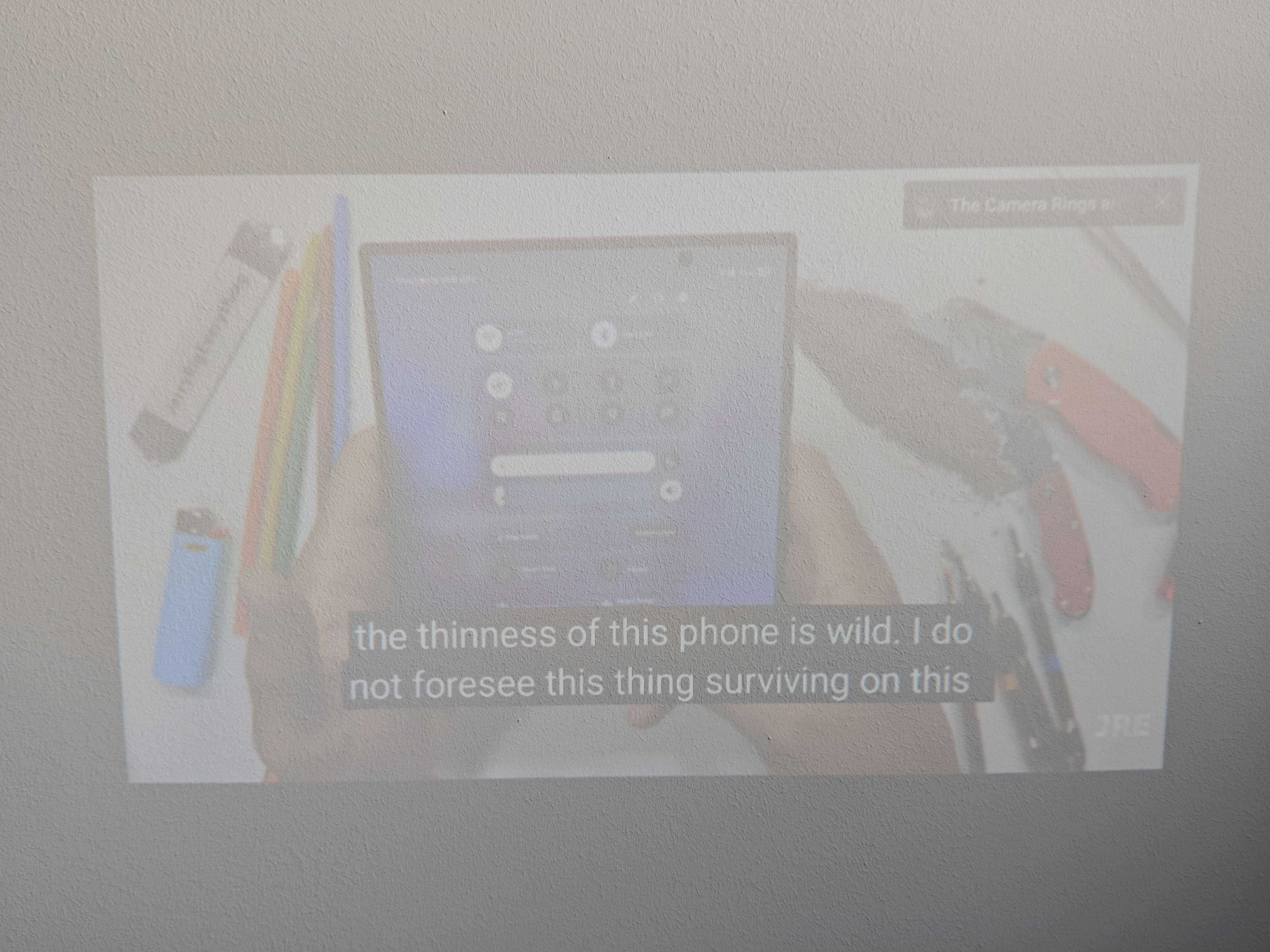 Das größte Thema dürfte die Helligkeit sein, denn 150 Lumen sind nicht besonders viel. Nicht bei selbstleuchtenden Smartphone-Displays und besonders nicht bei anzustrahlenden Flächen. Aktuelle Mittelklasse-Projektoren kommen auf 1.000 bis 2.000 Lumen und kämpfen bereits bei Sonneneinstrahlung. Das heißt für den Projektor des Armor 34 Pro: je dunkler der Raum, desto besser. Doch überraschenderweise reicht an einem trüben Tag schon eine weiße Wand im Inneren für eine mäßige Projektion. Natürlich sind hier weiterhin nicht viele Details zu erkennen. Aber um mal schnell etwas für mehrere Personen sichtbar zu machen, taugt es. Außen ist der Projektor tagsüber nicht zu gebrauchen. Erst, wenn es dunkel wird, ist auch hier eine Projektion sinnvoll möglich.