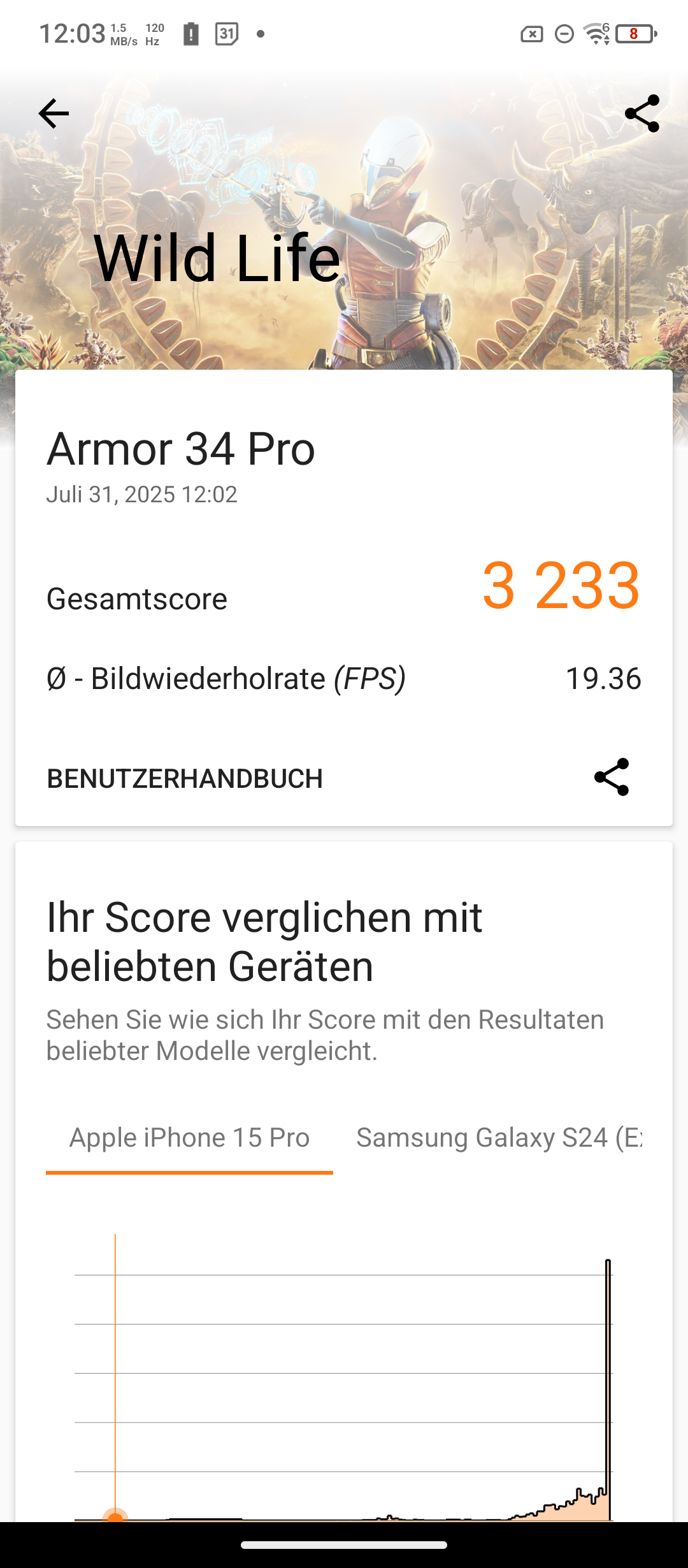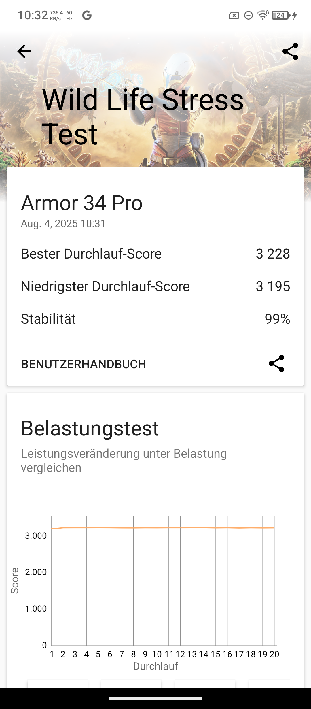 Leider kommt es beim Akkubenchmark in jedem Durchlauf zum Absturz bei ca. 50 %. Somit erhalten wir keine verlässlichen Werte. Allerdings dauerte es bis zu diesem Punkt länger als 24 Stunden. Sollte jemand das Armor 34 wirklich für den täglichen Gebrauch nutzen wollen, dann müsst ihr wohl weniger als einmal in der Woche laden. Die einzige Funktion, die es schafft, die Prozente purzeln zu lassen, ist der Beamer. Und selbst da hält das Ulefone Armor 34 Pro über 3 Stunden durch, also ausreichend für einen Spielfilm.