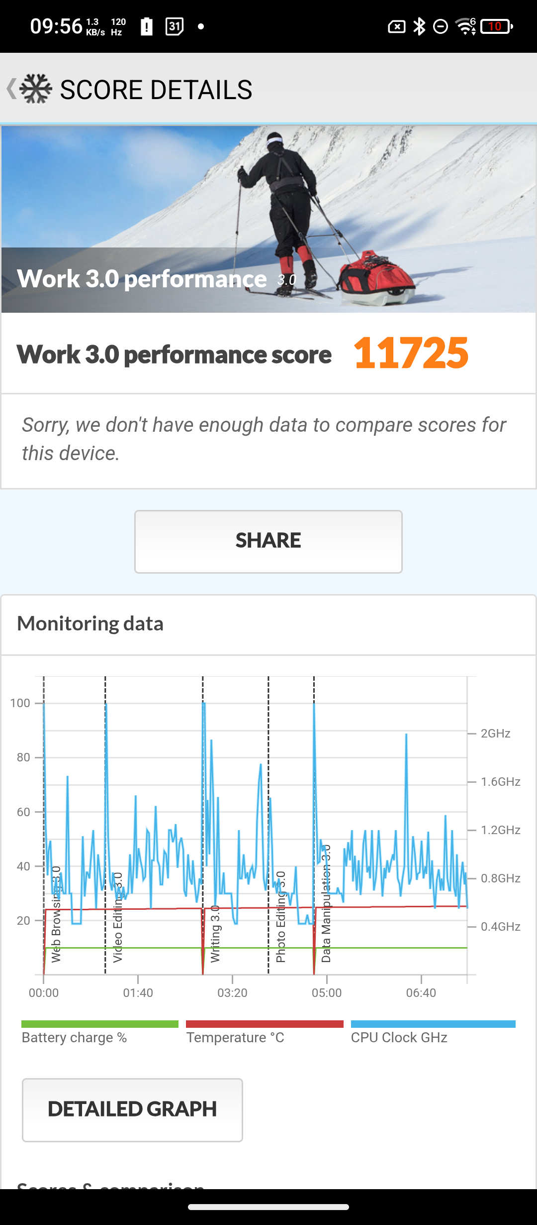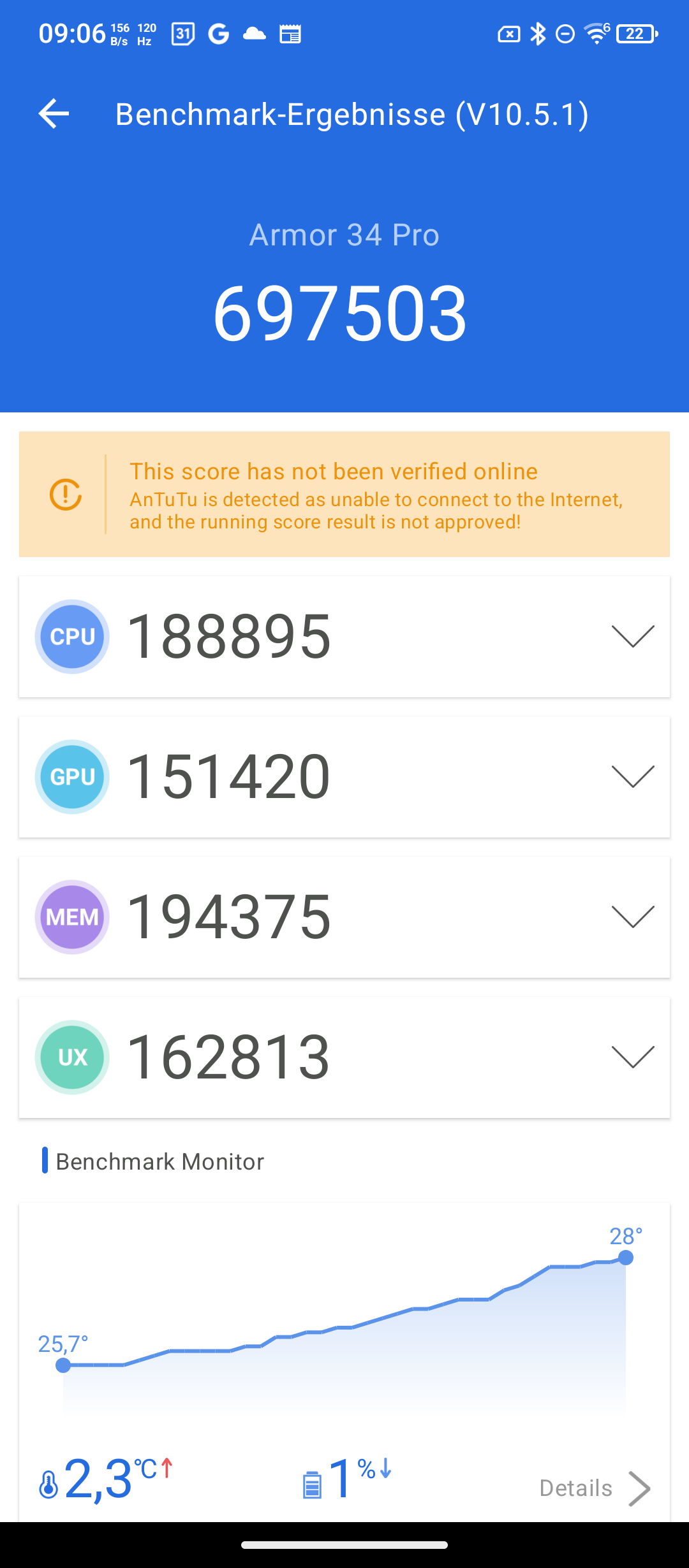 Doch was uns wirklich interessiert, sind die Akkubenchmarks. Wie immer haben wir dafür die Helligkeit auf rund 200 Lumen begrenzt und lassen den PCMark von 100 % anlaufen. Dieser endet, wenn das Smartphone bei 20 % seiner Akkuladung angekommen ist.