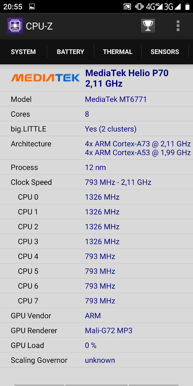 | CPU | Mediatek Helio P70 - 4 x 2,1GHz + 4 x 1,9Ghz |