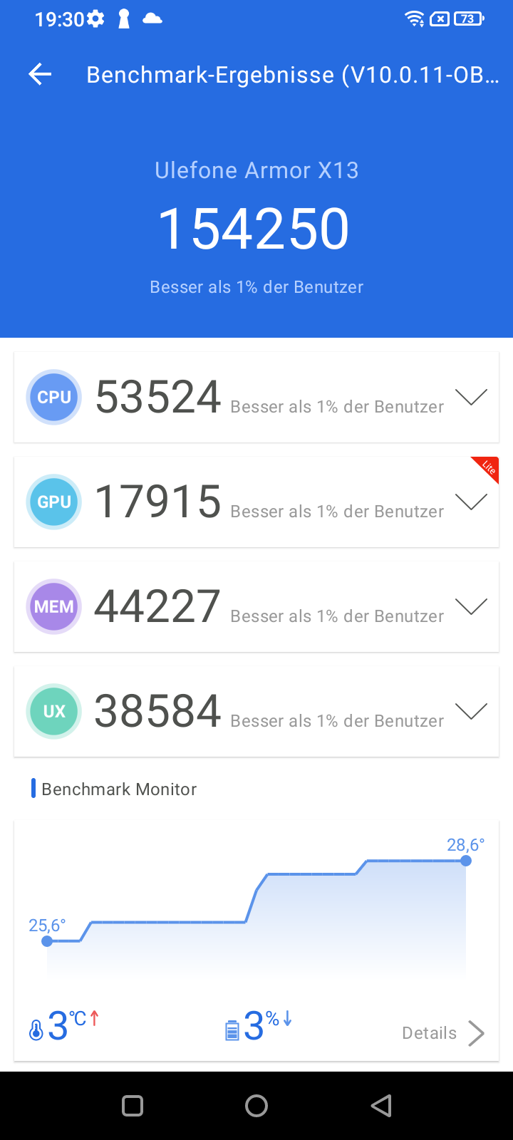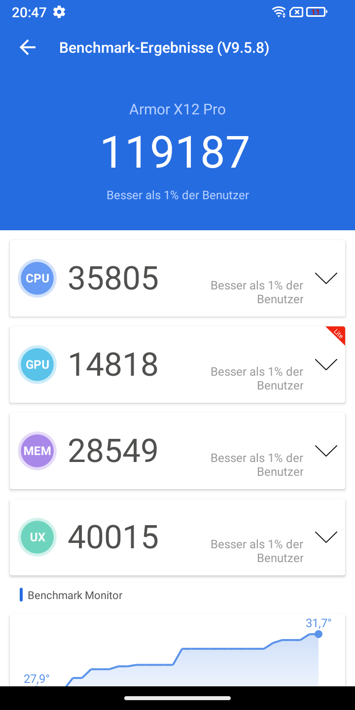 Die Laufzeiten bewegen sich im Bereich von 11 und 16 Stunden und sind damit akzeptabel. Das kleine Smartphone musste ich durchschnittlich alle zwei Tage laden, im Gegensatz zum Armor X13, welches erst nach drei Tagen eine Aufladung benötigte.