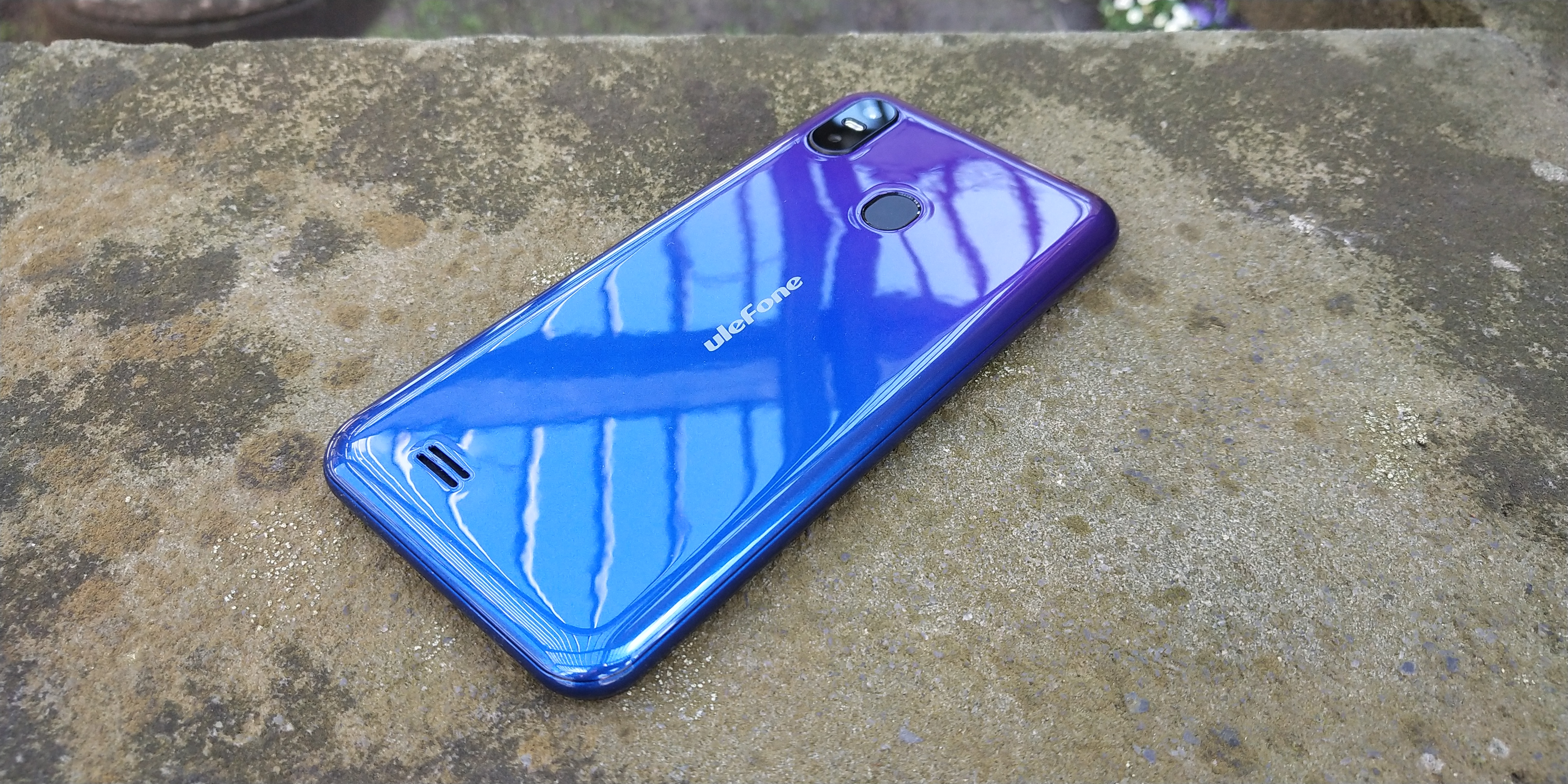 Oben rechts ist die Dual Kamera vertikal angebracht. Sie ragt nur ca. 1mm aus dem Gehäuse hervor. Ich gehe stark davon aus, dass sich mit der Zeit Staub- und Dreckpartikel gerne zwischen Kamera und Gehäuse sammeln werden. Zwischen beiden Sensoren ist der Dual LED Blitz untergebracht. In der Mitte befindet sich der Fingerabdrucksensor. Hier war Ulefone innovativ und hat den Sensor oval und nicht, wie meist üblich, rund designed. :). In der Mitte befindet sich längs geschrieben der Herstellername. Zu guter Letzt sind unten links die Lautsprecheröffnungen angeordnet. Es handelt sich um 2 kleine Schlitze, die in das Gehäuse eingelassen sind. Ich bin mir nicht ganz sicher, ob das Absicht oder doch ein kleiner Verarbeitungsfehler ist, denn die kleine Strebe dazwischen wirkt als wäre sie verbogen. Tatsächlich aber wurde hier zu dick lackiert, was zu einer kleinen Farbnase führt. Die linke Gehäuseseite ist komplett „clean“. Auch die Unterseite des Gehäuses ist mit Ausnahme des Lochs für das Mikrofon ebenfalls quasi leer. Auf der Oberseite befindet sich der Klinkenanschluss sowie der mittlerweile eigentlich ausgediente Micro-USB Anschluss. Für absolute Low-Budget Geräte mag man das noch akzeptieren wollen, aber auch andere Hersteller in diesem Preissegment schaffen es einen USB-C Anschluss zu integrieren. Auf der rechten Gehäuse Seite befinden sich Lautstärke und Power Buttons. Diese sind gut zu erreichen, und haben einen fantastischen Druckpunkt. Dem Einem oder Anderem mag er vielleicht einen Tick zu stark sein, aber ich persönlich finde ich sehr gut gelungen. Bei der uns vorliegenden Version des S10 Pro‘s sind alle 3 Knöpfe in Lila gehalten.