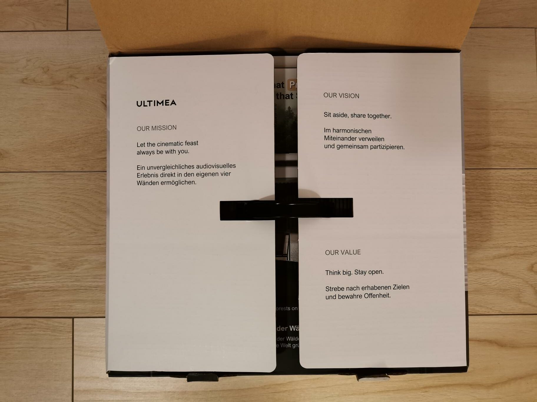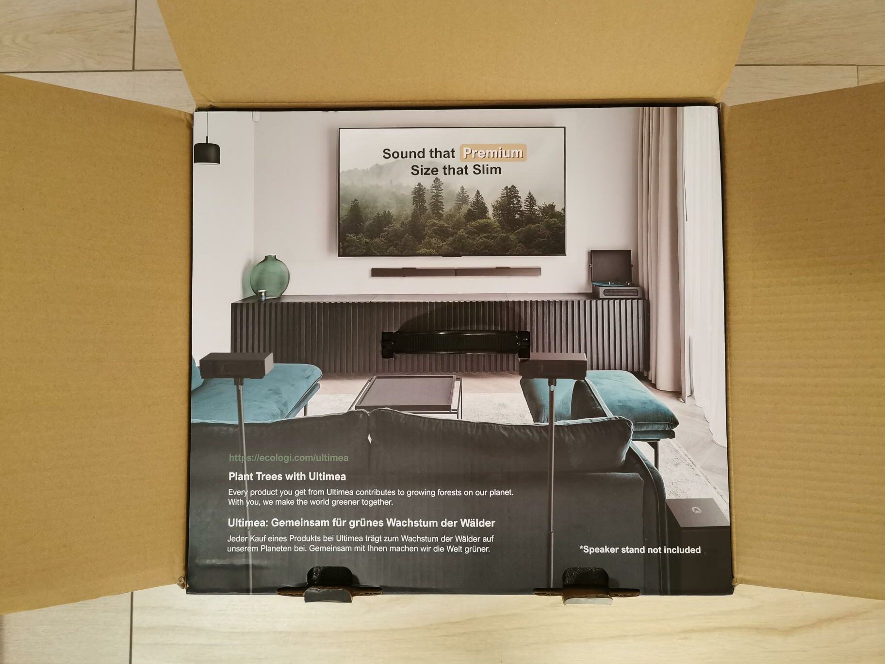 Wie schon bei der preiswerten Poseidon D60 Soundbar, scheint Ultimea besonderen Wert auf eine intelligente und vor allem sichere Verpackung zu legen. Natürlich könnte ich an dieser Stelle den Moralapostel spielen und kritisieren, dass das Unternehmen bei der Polsterung statt auf nachwachsende Rohstoffe auf Polyethylenschaum zurückgreift. Ich möchte aber lieber lobend erwähnen, dass alle Einzelteile nicht nur sauber in Folie verpackt sind, sondern auch ihren stoßsicheren Platz im Inneren des Kartons gefunden haben. Damit gewinnt Ultimea den fiktiven Verpackungspreis. Den Grünen Daumen gibt es dafür allerdings nicht. 🙂