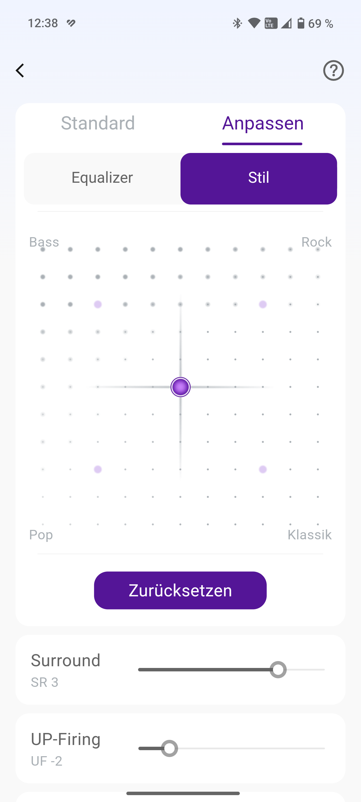 Bis zur Stufe „Bass +4“ kommt es nicht zum Dröhnen. Ein tiefer betonter Klang hätte dem Ultimea Skywave X40 besser gestanden. Über den Equalizer könnt ihr dem System diesen Klang jedoch nicht aufzwingen. Anders ausgedrückt: Die Trennfrequenz hätte höher gewählt werden können, um den Subwoofer mehr einzubinden.