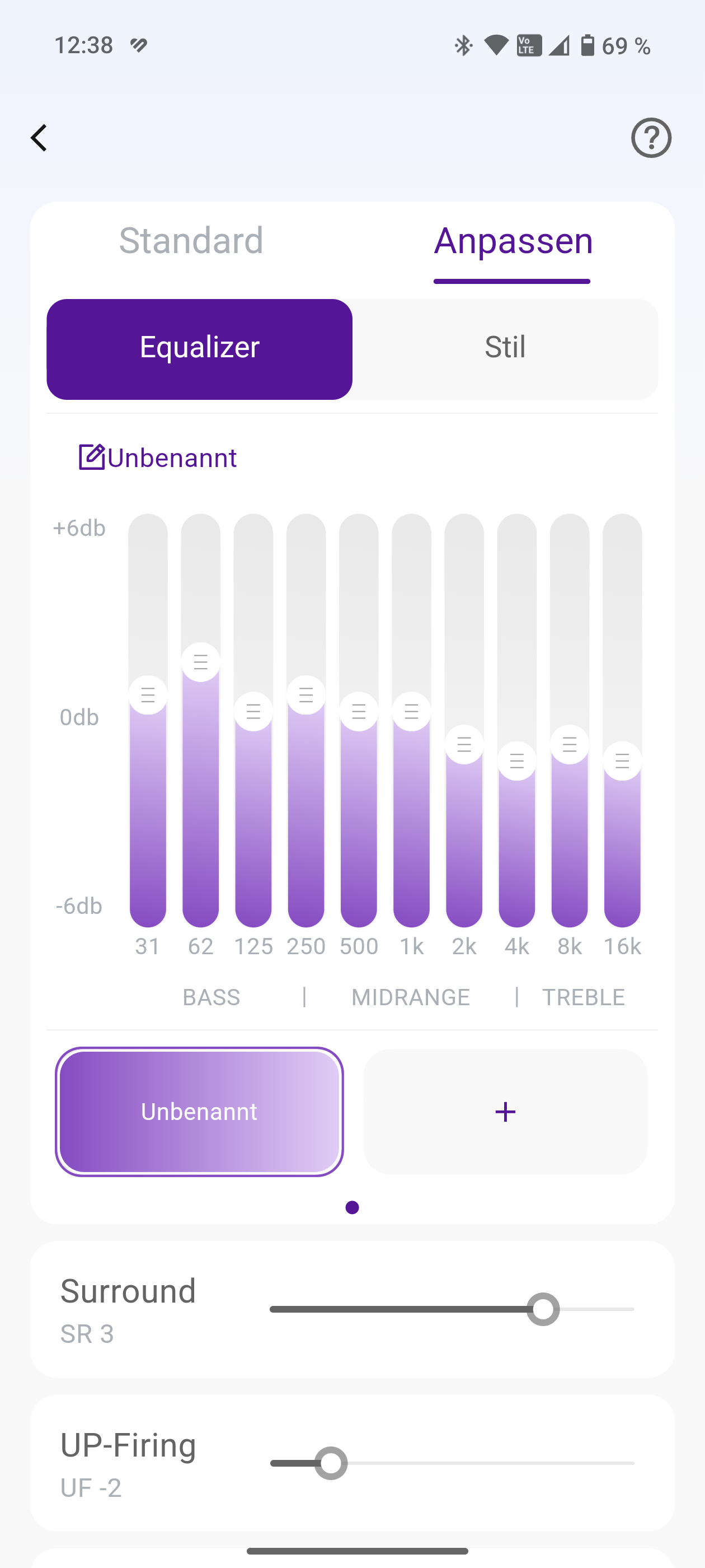 In der App könnt ihr euch am besten einen eigenen Equalizer einstellen, um den Sound an die persönlichen Vorlieben anzupassen. Hier können zehn Frequenzbereiche angepasst und auch mehrere eigene Equalizer angelegt werden. Mir hat der Klang ab Werk nicht zugesagt, dazu gleich mehr.