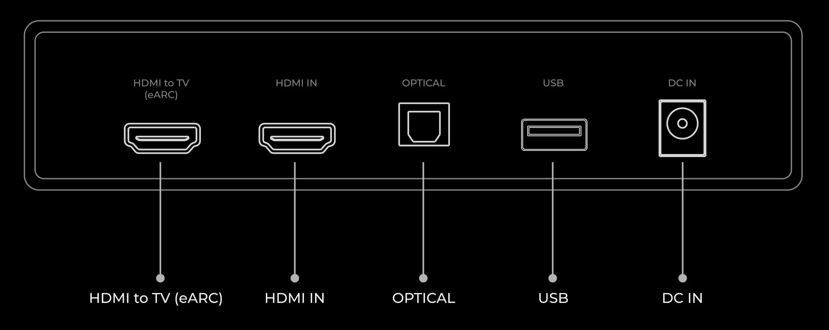 Alle Anschlüsse befinden sich an der Ultimea Skywave X40 Soundbar. Der wichtigste ist wohl der „HDMI to TV“-Anschluss mit eARC-Unterstützung. Wenn euer (halbwegs moderner) Fernseher dies unterstützt, funktioniert die Soundausgabe reibungslos und unkompliziert.