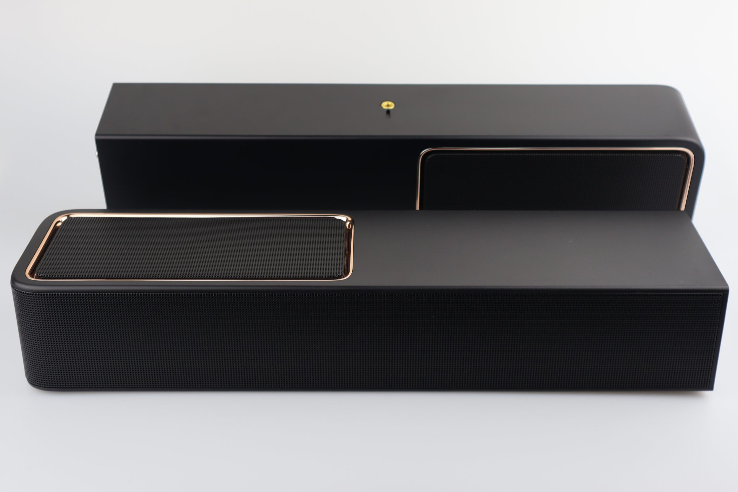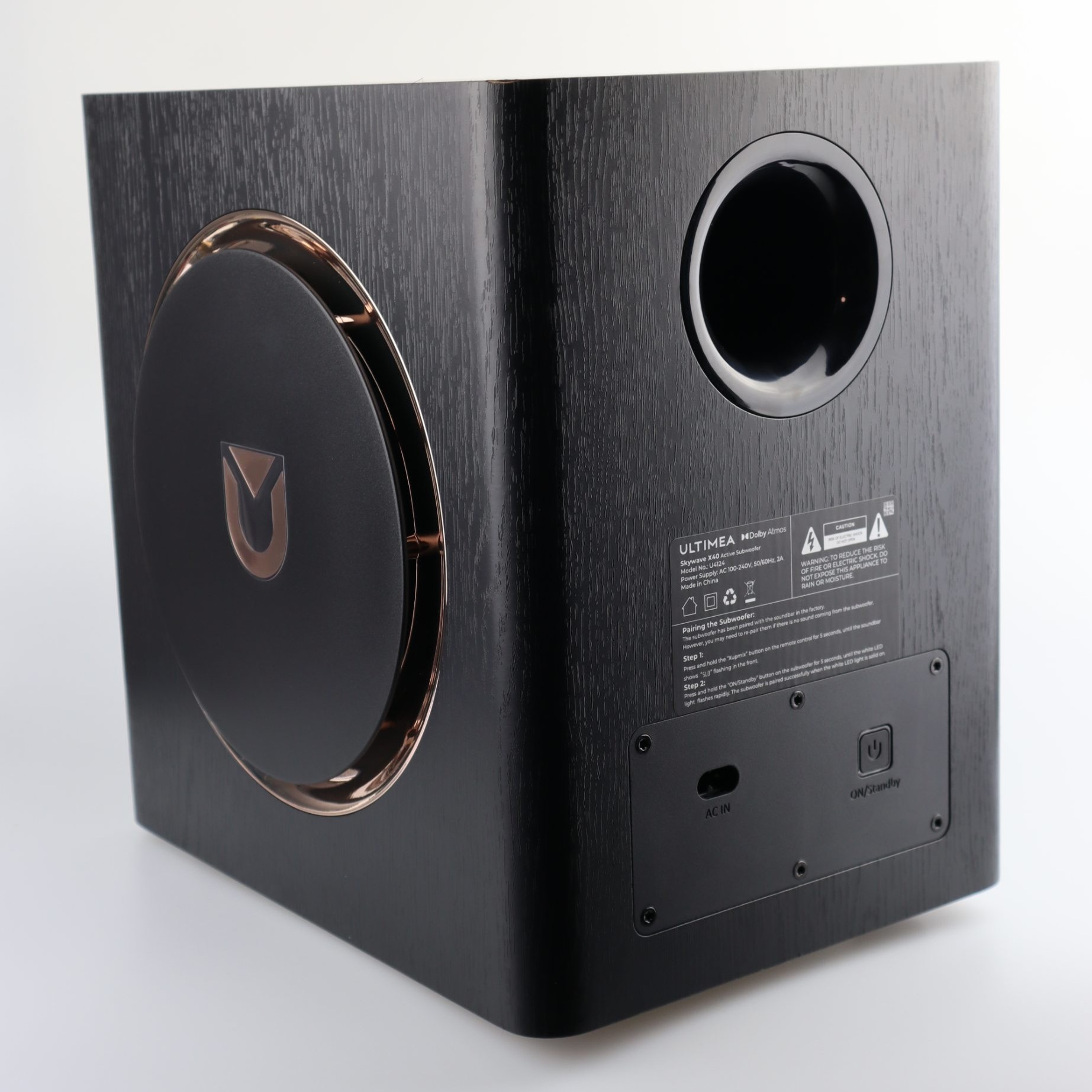 Das schicke Design des Ultimea-Soundsystems ist in Schwarz gehalten und harmoniert mit den kupferfarbenen Akzenten (wie beim Hersteller Klipsch). Der große Subwoofer hat nur hinten eine Öffnung und auf der rechten Seite die große Membran. Diese wird optisch etwas auffälliger hervorgehoben, ansonsten ist alles zurückhaltend gestaltet. Das Dot-Display der Soundbar leuchtet nur bei Eingaben auf und kann gedimmt werden. Beim Ein- und Ausschalten gibt das System eine kurze Melodie von sich.