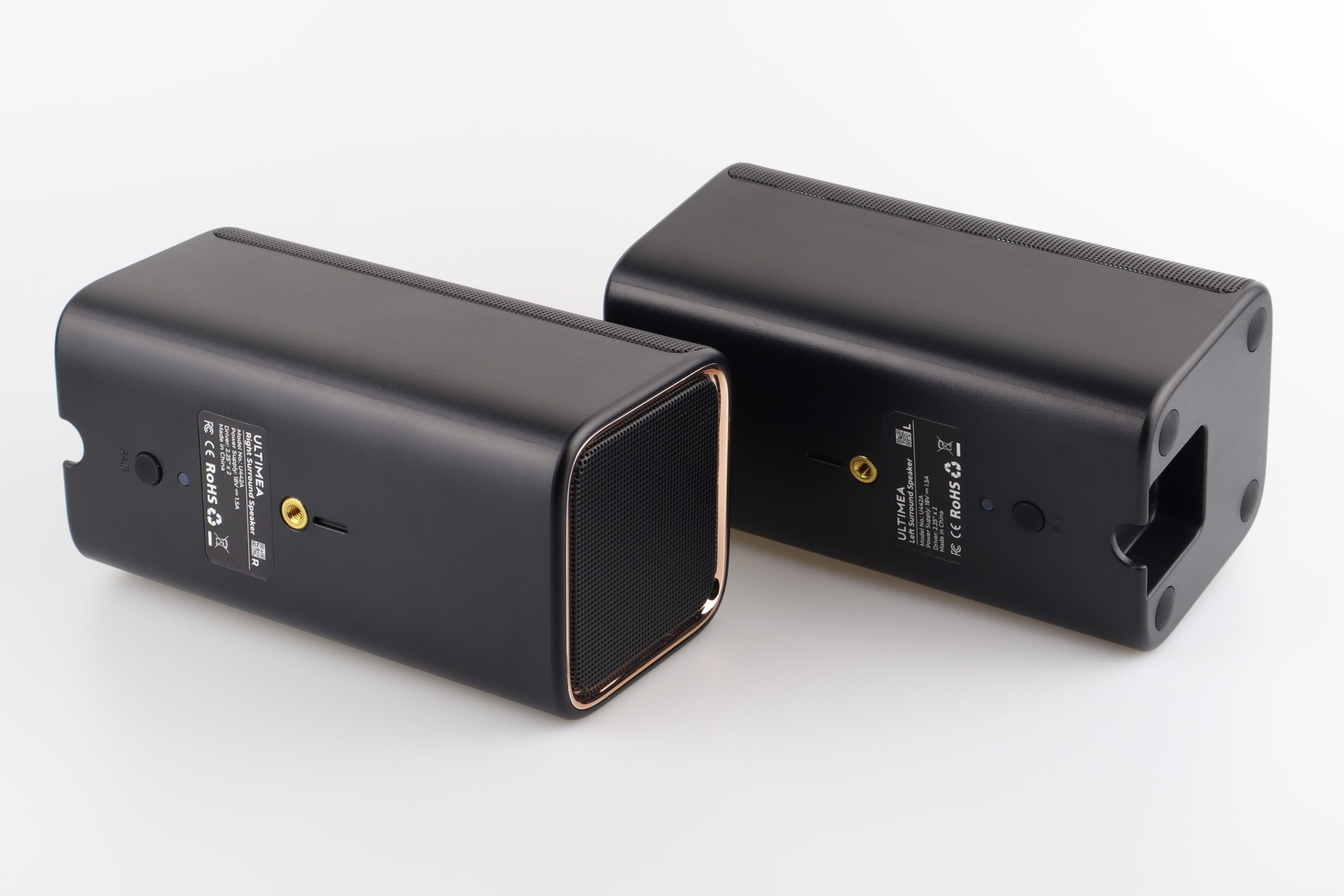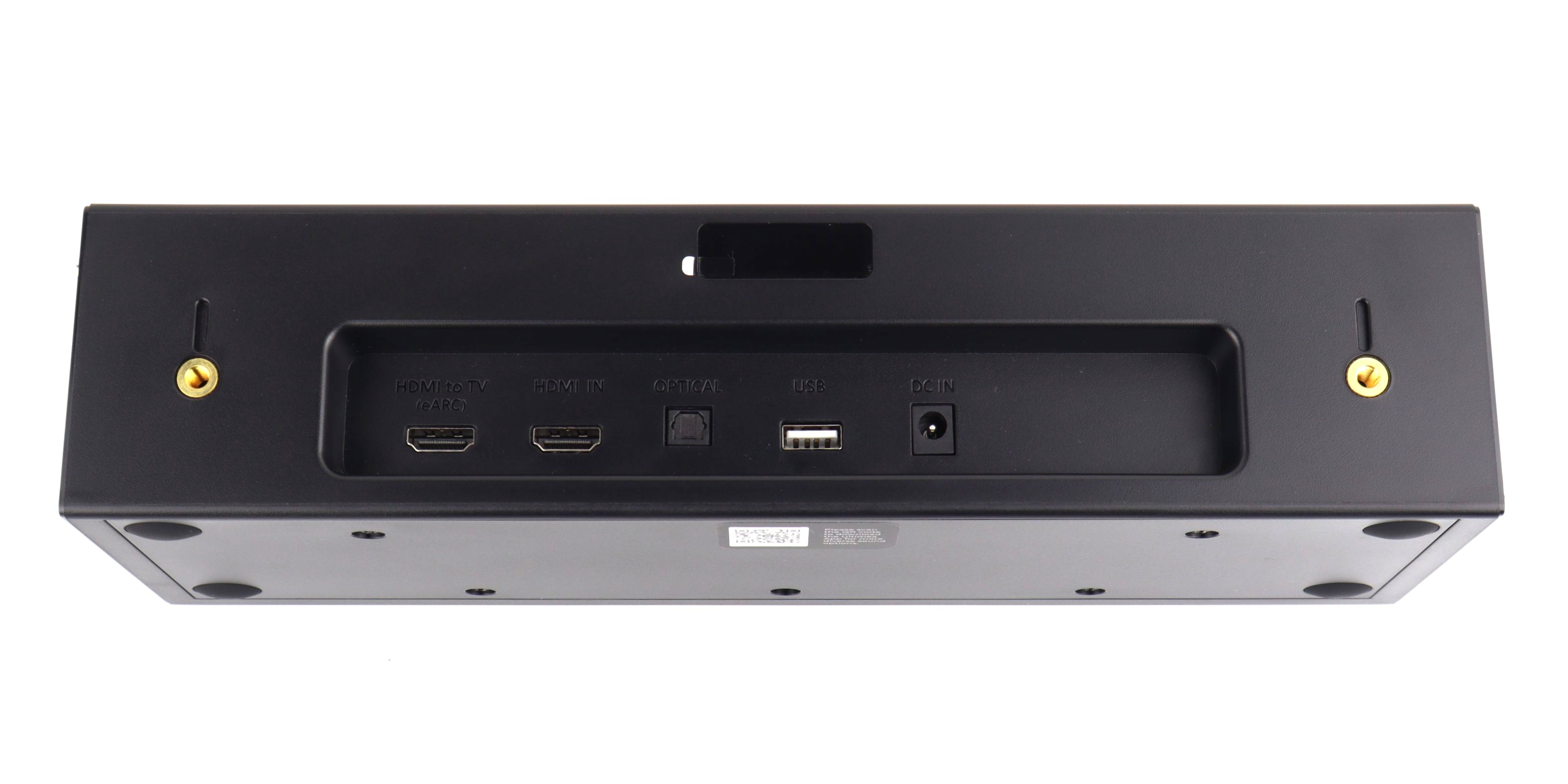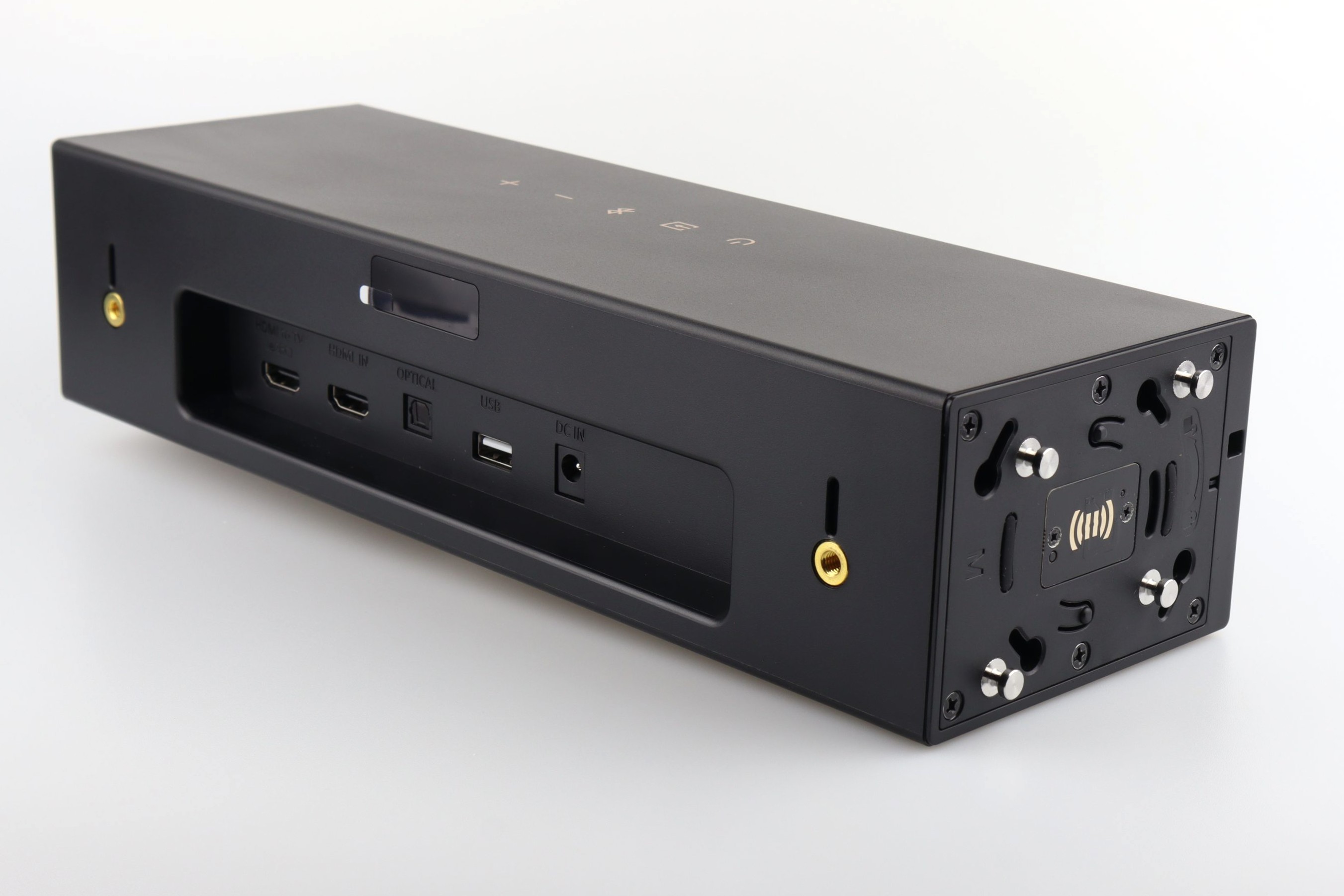 Das Design des Ultimea-Soundsystems ist in schickem Schwarz mit kupferfarbenen Akzenten gehalten. Der große 10-Zoll-Subwoofer mit seiner seitlichen Membran ist ein echter Hingucker, allerdings auch sehr groß. Alle Anschlüsse befinden sich an der Soundbar, darunter der wichtige „HDMI to TV“-Anschluss mit eARC-Unterstützung, ein weiterer HDMI-Eingang, ein optischer Anschluss und ein USB-Anschluss. Dort befinden sich auch die Bedienelemente.