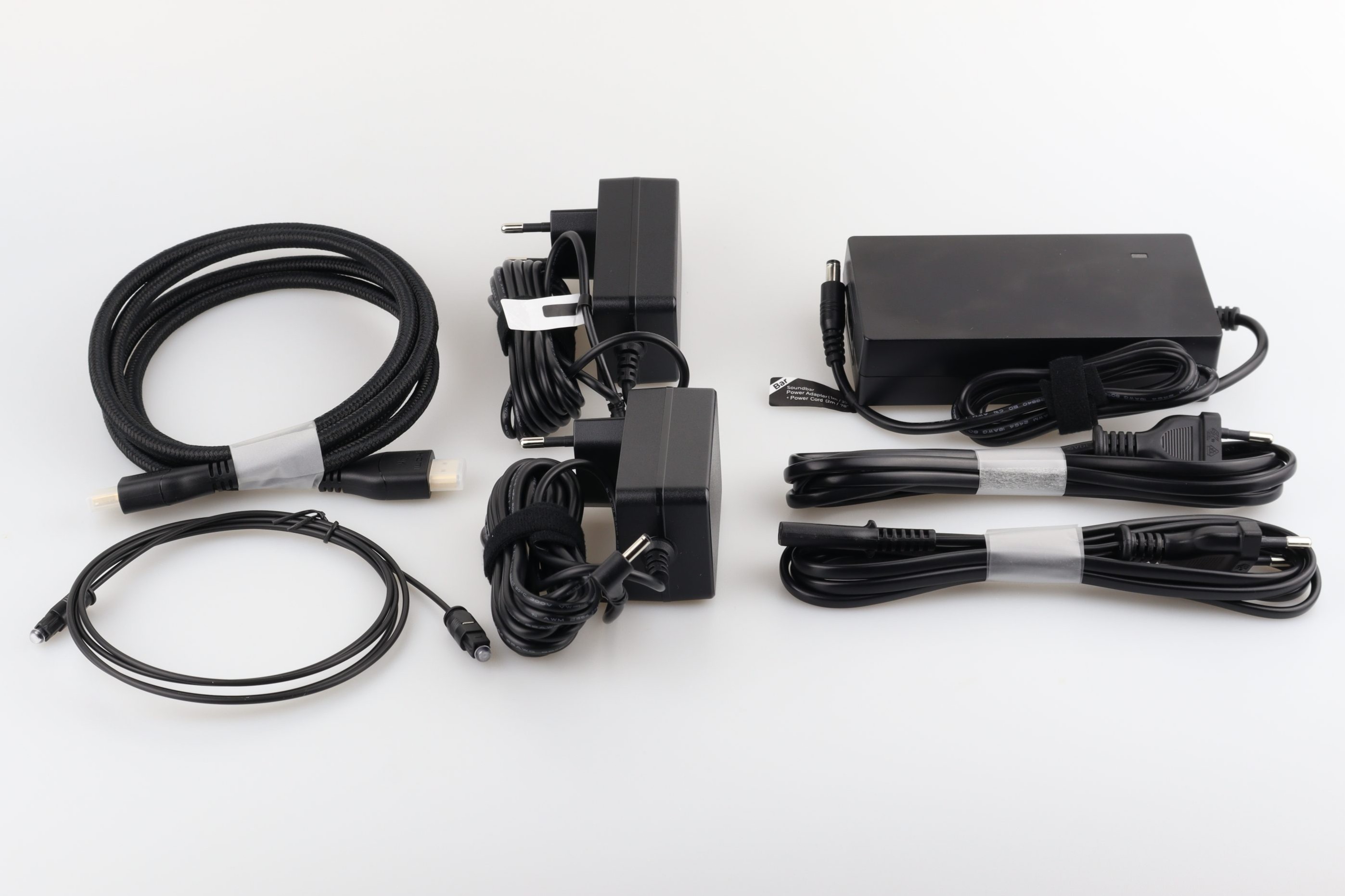 Neben den Lautsprechern sind im Lieferumfang alle nötigen Netzteile, ein stoffummanteltes HDMI-Kabel, ein optisches Kabel sowie Wandhalterungen enthalten. Die Soundbar der großen Ultimea Skywave X70 hat ein externes Netzteil, während es bei der kleinen Skywave X40 in der Soundbar integriert ist.