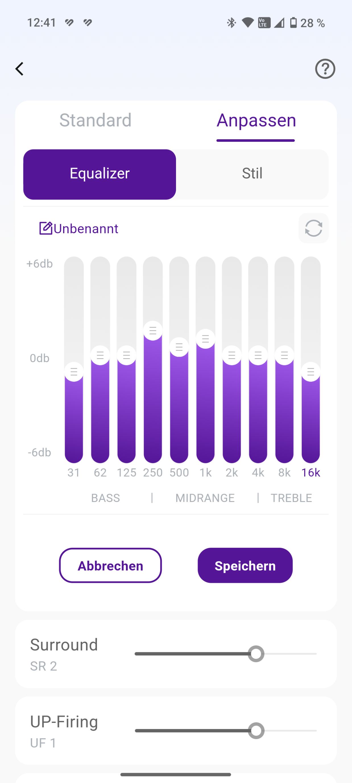 Beim Equalizer solltet ihr „Xupmix“ unbedingt ausschalten und die unteren Mitten etwas anheben, um ein stimmiges Klangbild zu erhalten. Unabhängig davon könnt ihr noch verschiedene Profile auswählen, wobei ich „Cinema“ bevorzuge.