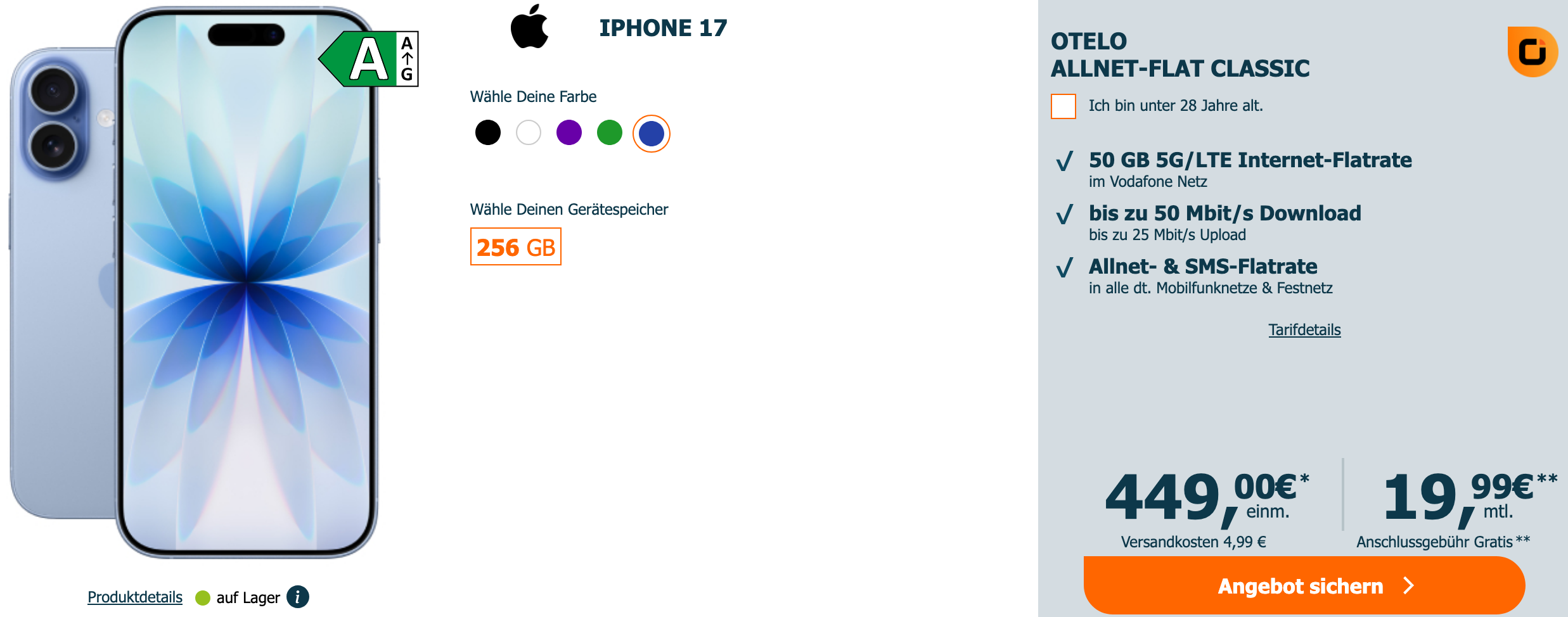 Abseits der Netzbetreiber Telekom, Vodafone und O2 lohnt sich oft ein Blick auf die “zweite Reihe” der Discounter. Diese bieten zwar meist einen reduzierten Leistungsumfang, punkten dafür aber häufig beim Preis. Ein solches Angebot liefert aktuell der Händler Logitel mit dem iPhone 17 in Verbindung mit einem Tarif beim Provider Otelo. Konkurrenzlos günstig zahlt ihr hier nur knapp 924€ über die Vertragslaufzeit von 2 Jahren, könnt das iPhone in allen Farben bestellen und erhaltet monatlich 50GB Datenvolumen inklusive.