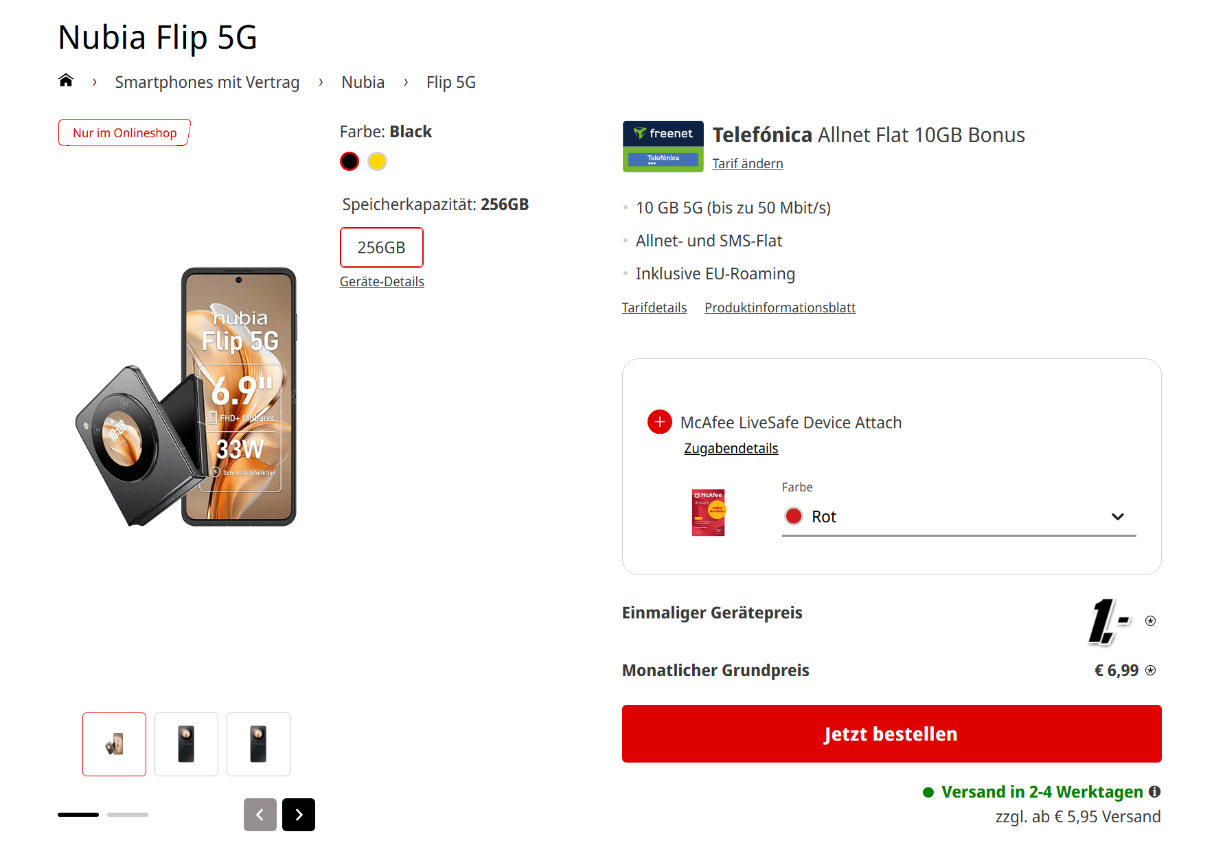 Abzüglich des Marktpreises des Nubia Flip 5G von rund 330€ ist der Tarif für die nächsten zwei Jahre kostenlos. Dazu könnt ihr zwischen Schwarz und Gold als Farbe wählen. Das kann sich wirklich sehen lassen, für 10GB im O2-Netz mit 5G-Nutzung. Über die Netzabdeckungskarte könnt ihr einen eigenen Eindruck für eure Region gewinnen. In den vergangenen Monaten hat sich der Mobilfunkanbieter in diesem Punkt massiv gesteigert.