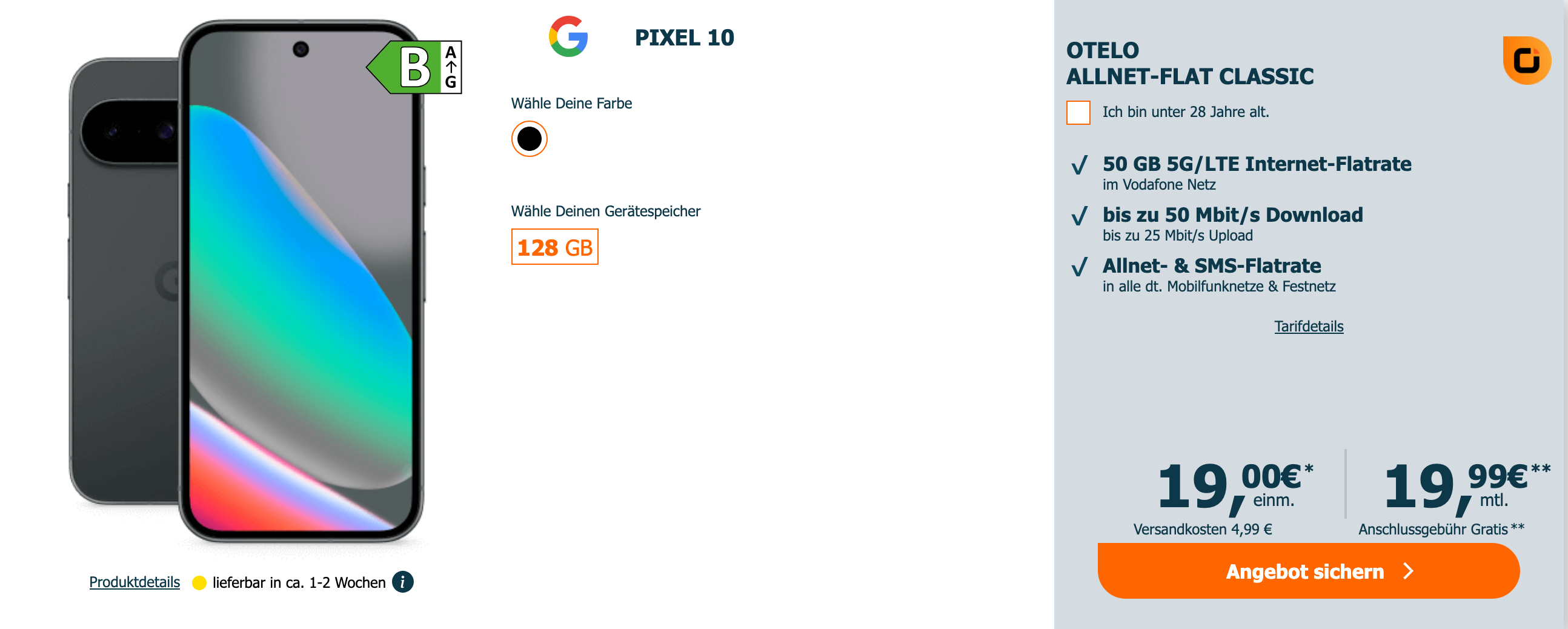 Wer es nicht eilig hat, erhält aktuell das Google Pixel 10 mit einem 50GB-Tarif im Vodafone-Netz unter Neupreis. Der Händler Logitel gibt die Lieferzeit mit 1–2 Wochen an; das solltet ihr bei der Kaufentscheidung bedenken. Dafür spart ihr hier mit Vertrag knapp 80€ gegenüber dem Neupreis, und habt noch den Mobilfunktarif dazu.