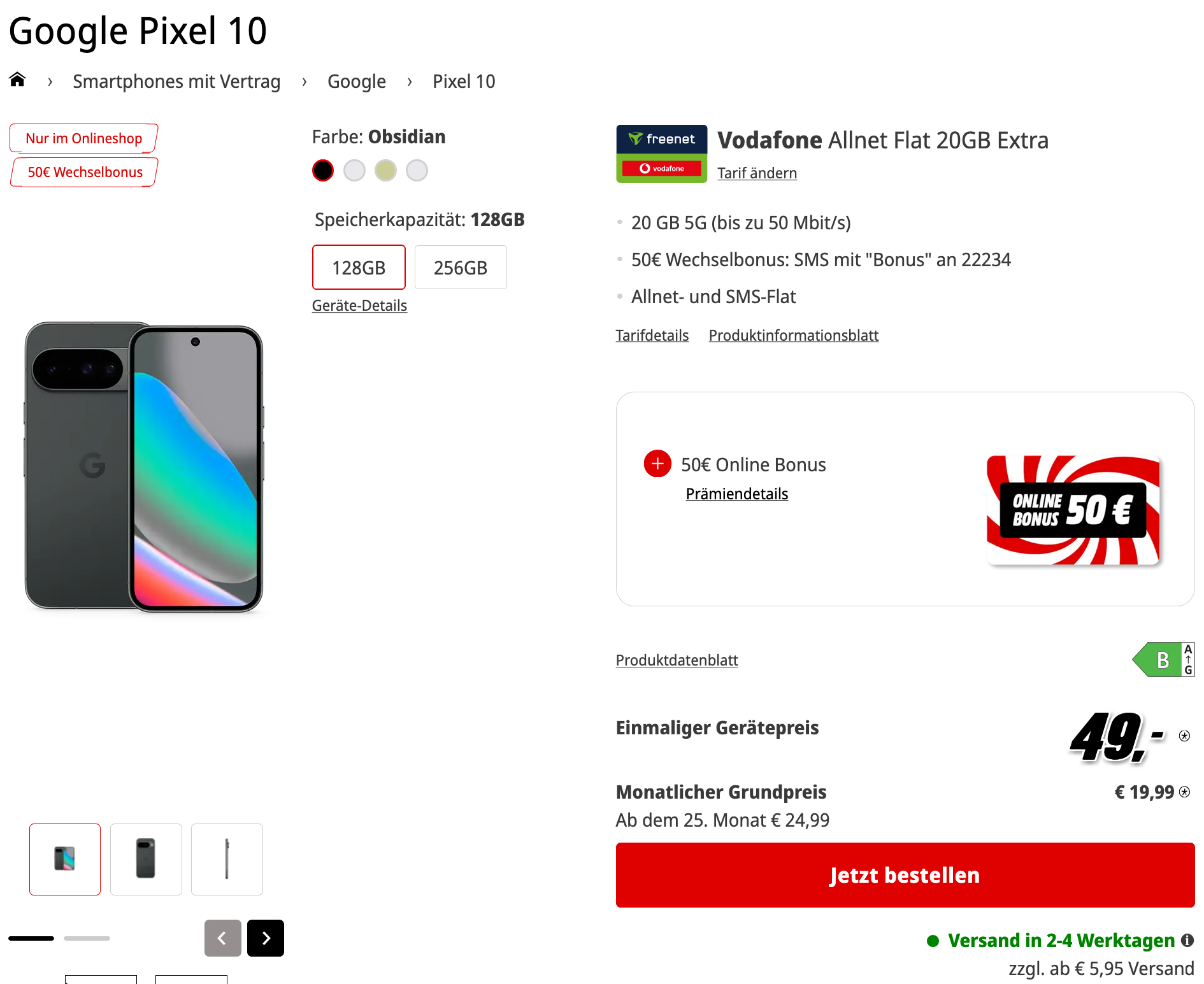 Die MediaMarkt Tarifwelt hat ausgewählte Angebote um einen Online-Bonus ergänzt, wodurch die Preise pünktlich zur heißen Phase des Black Friday 2025 äußerst attraktiv werden. So erhaltet ihr beispielsweise das Google Pixel 10 (128GB) in Kombination mit einem 30GB 5G-Vertrag im Vodafone-Netz für Gesamtkosten von nur 475€. Bei einem aktuellen Neupreis von über 600€ entspricht dies einer Ersparnis von deutlich über 100€!