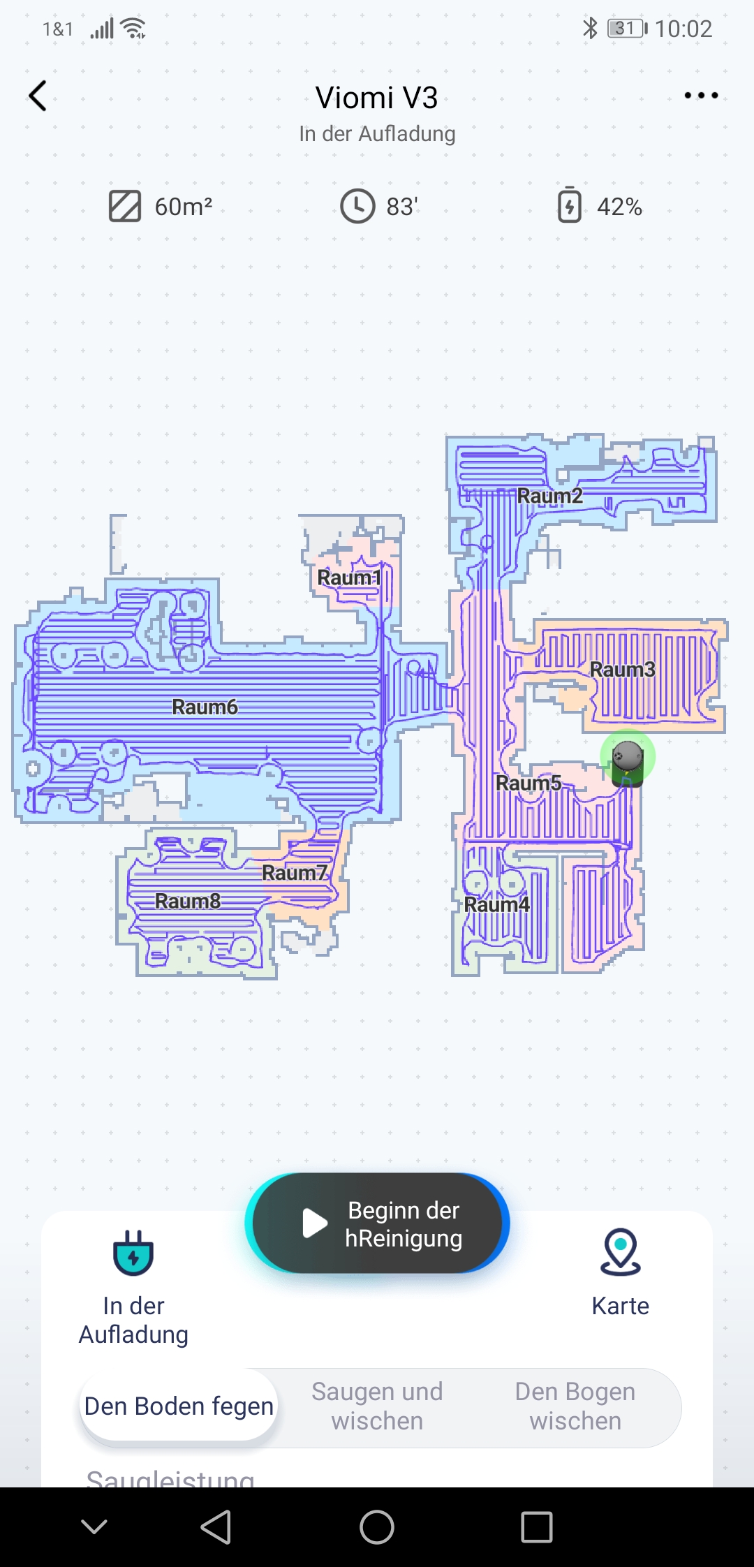 Unabhängig von der Reiningsqualität gibt es jedoch eine Sache, die mich während des 3-wöchigen Testzeitraumes wirklich gestört hat. Die Art und Weise der Navigation ist nicht auf dem Niveau seiner Konkurrenz. Nicht falsch verstehen: Der Viomi V3 beherrscht das Navigieren aus der Ladestation in Perfektion, aber wehe man legt selbst Hand an! Da es keine “Gehe zu-Funktion” gibt, muss man den Staubsauger immer dazu zwingen, einen Raum reinigen zu lassen, wenn man ihn einfach nur woanders hin bewegen möchte. Hat er sein Ziel erreicht, kann man die Reinigung natürlich pausieren, bzw, stoppen. Letztes führt dann aber leider sehr oft zu einem völligen Verlust der Orientierung. Das, obwohl der Staubsauger es auch ab und an beherrscht, seine Position zu finden, nachdem man ihn einmal händisch umgesetzt hat. In der Folge dreht sich der Viomi V3 einige Mal um seine eigene Achse, um dann in der App sich auf einer völlig anderen Position wiederzufinden. Eine effektive Reinigung ist nicht mehr möglich. Auch das Umsetzen zur vermeintlich in der App gezeigten Position verschafft keine Abhilfe.