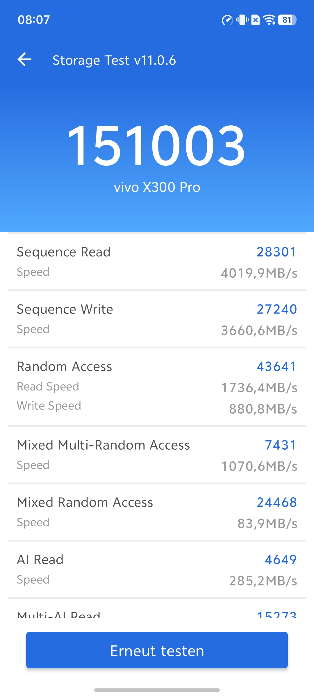 Im Vivo X300 Pro kommt mit dem MediaTek Dimensity 9500 der neue Top-Prozessor zum Einsatz. MediaTek setzt erneut auf ein neues Chip-Design und verzichtet vollständig auf die klassischen Effizienzkerne. Folgendermaßen setzt sich das Layout zusammen: 1x C1-Ultra-Kern @ 4,21GHz, 3x C1-Premium-Kerne @ 3,5GHz sowie 4x C1-Pro-Kerne @ 2,7GHz. Die GPU-Aufgaben übernimmt eine Mali G1-Ultra. Beim Festspeicher kommt der aktuelle UFS-4.1-Standard zum Einsatz. Ihr könnt zwischen 256GB, 512GB und 1TB wählen. Dazu gibt es wahlweise 12GB bzw. 16GB Arbeitsspeicher. In unseren Tests erreichte der Speicher sehr gute Lese- und Schreibgeschwindigkeiten von 4019MB/s bzw. 3660MB/s.