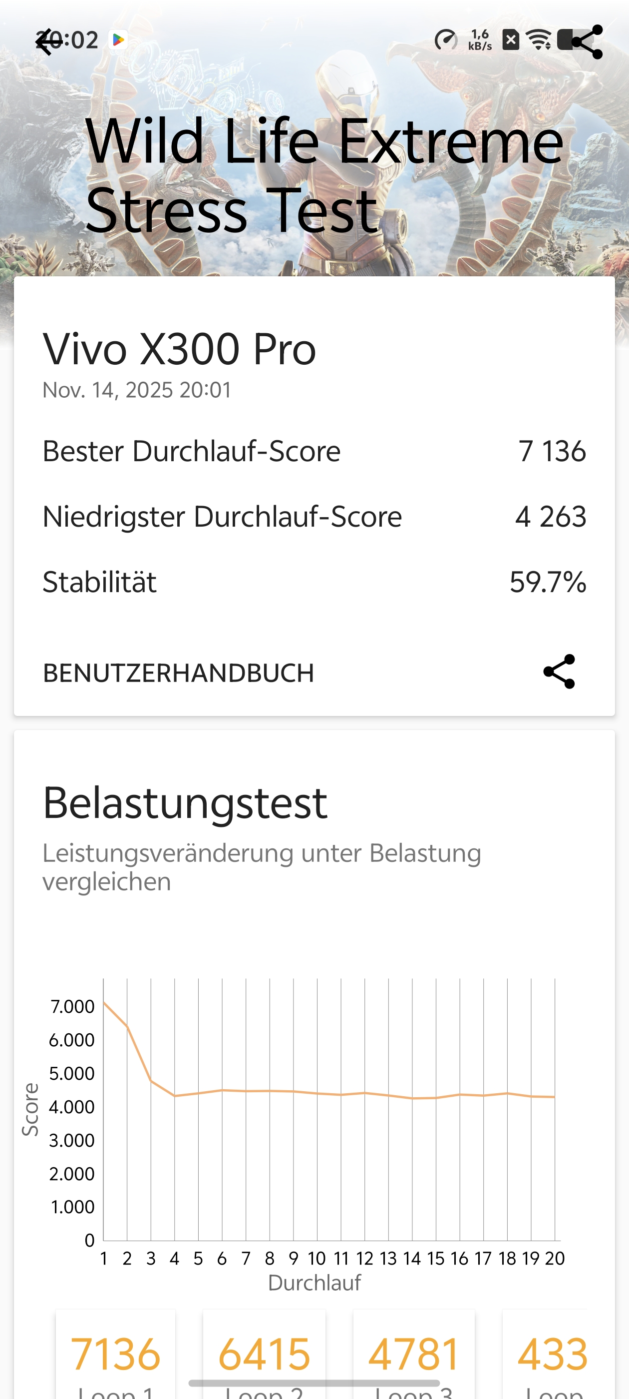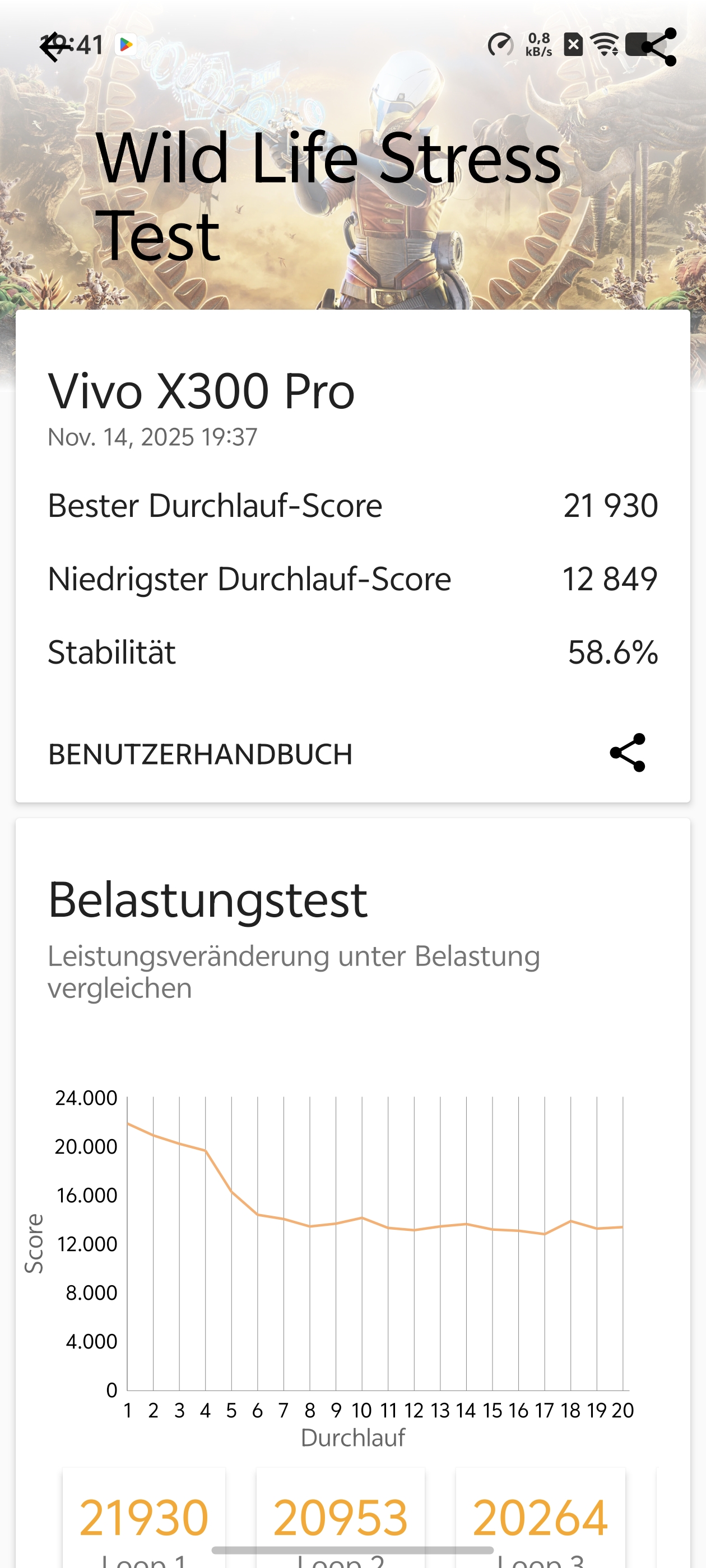 Genauso wie der Snapdragon 8 Elite Gen 5 neigt auch der MediaTek dazu, ein Hitzkopf zu sein, und reduziert die Leistung bei anspruchsvolleren Aufgaben bzw. Benchmarks deutlich. Im Alltag merkt ihr davon wenig und auch beim Gaming solltet ihr selbst bei einer längeren Session keine Probleme mit der Performance oder der Abwärme haben. Die Leistung ist ohnehin so enorm hoch, dass ihr es schwer haben werdet, sie vollständig zu nutzen. Dennoch sind die Ergebnisse im Stresstest nicht besonders gut. Die GPU verlieren nach einer recht kurzen Zeit bis zu 40% Leistung.
