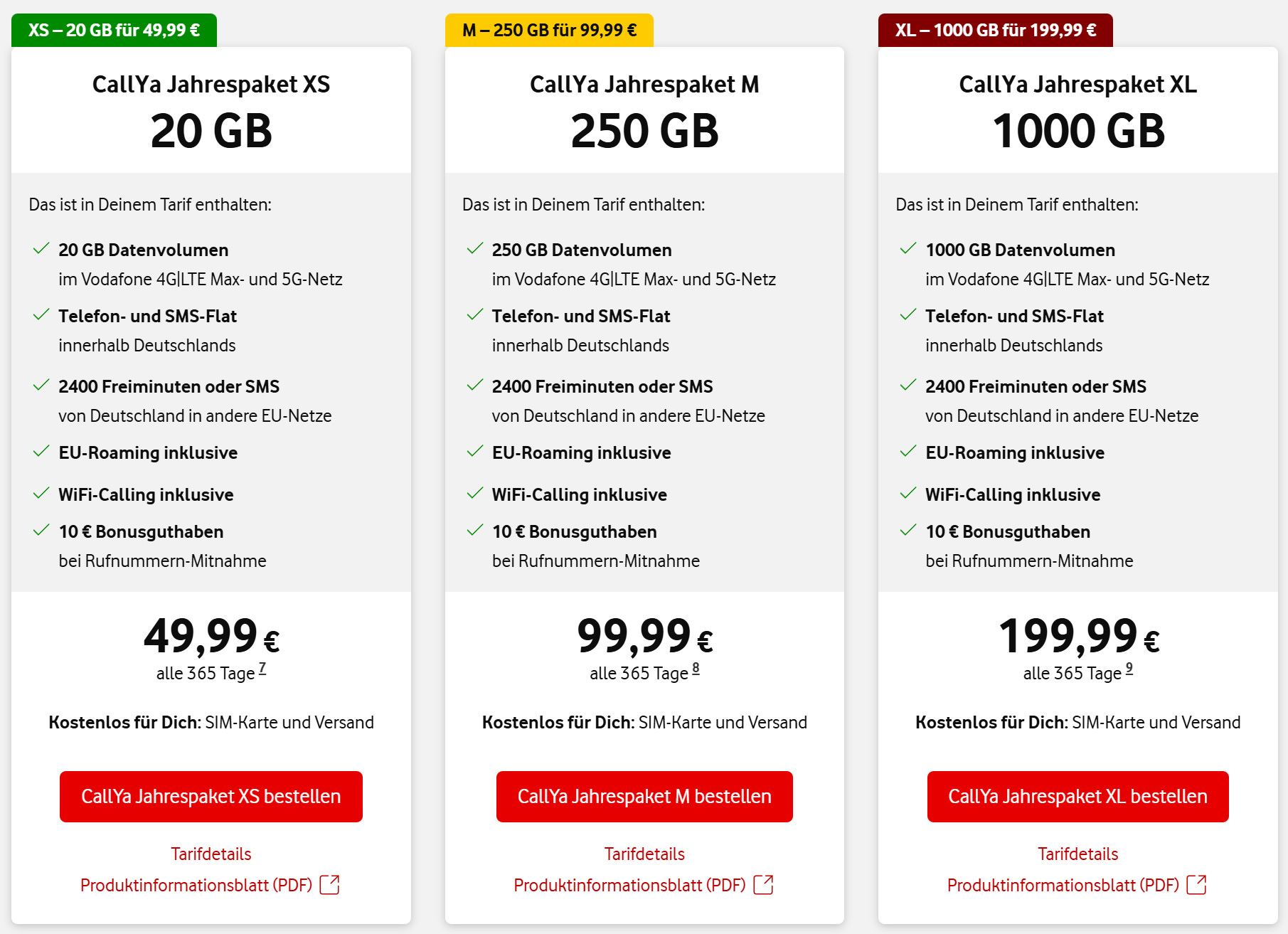 Falls euch die 250GB nicht ausreichen oder das Paket zu groß ist, bietet Vodafone zwei weitere Jahrestarife an. Auch hier gilt das Prinzip: Einmal zahlen, ein Jahr nutzen.