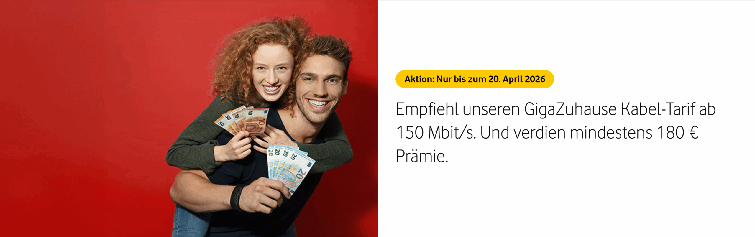 Dabei könnt ihr nicht nur die „GigaZuhause“-Kabelverträge empfehlen, für die es derzeit eine Erhöhung der Prämien gibt, sondern auch Mobilfunktarife und Jahrespakete. Wichtig: Euer Empfehlungslink ist nur für 30 Tage gültig und es dauert ungefähr drei Monate, bis euch die Prämie gutgeschrieben wird. Ihr müsst kein Vodafone-Kunde sein, um das Geld zu erhalten, und die eingeladene Person darf bereits Kunde bei dem Anbieter sein.