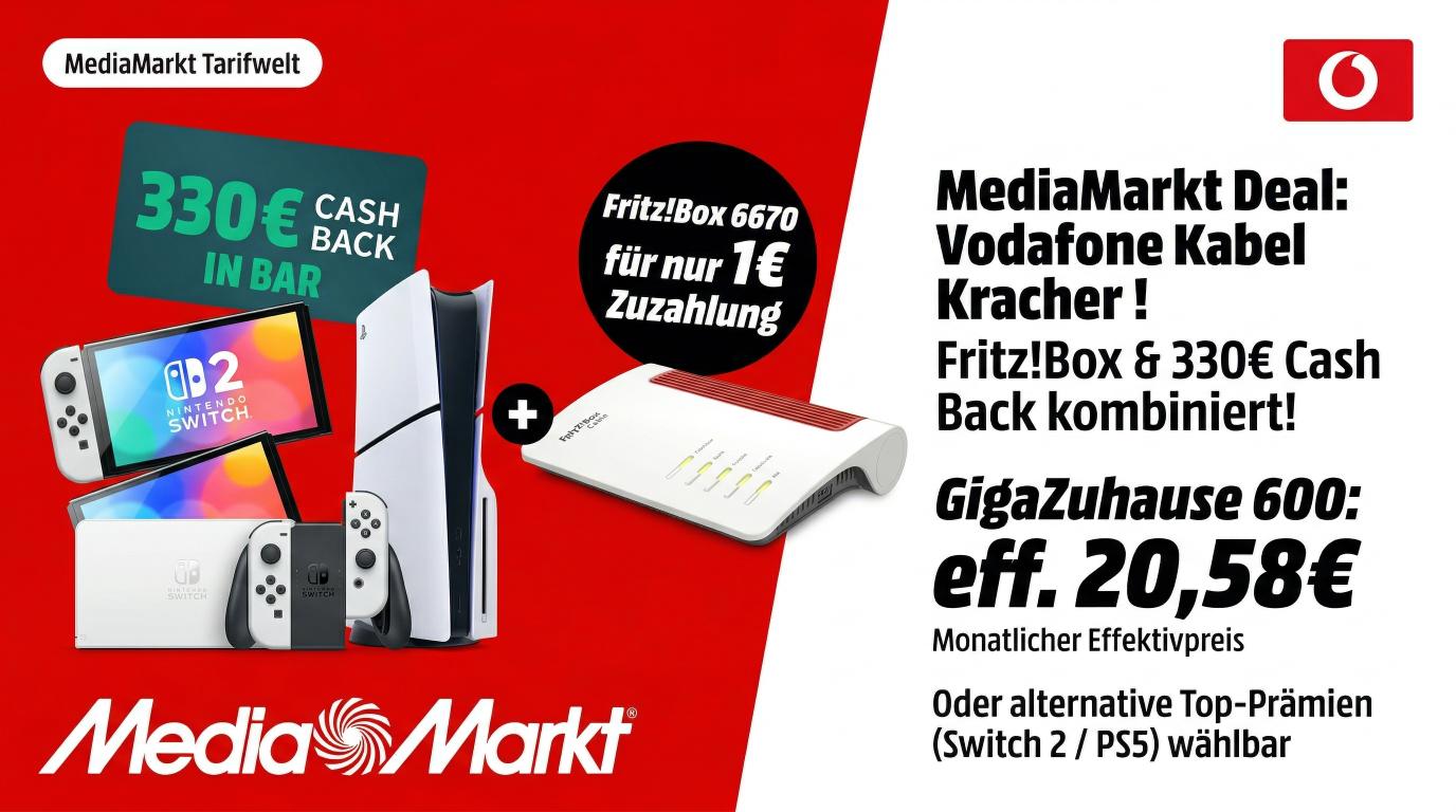 Die MediaMarkt Tarifwelt bietet aktuell Vodafone-Kabel-Tarife sehr günstig an, da ihr zwei Aktionen kombinieren könnt. Für nur 1€ Zuzahlung erhaltet ihr die Fritz!Box 6670 dazu und bekommt nach Vertragsbeginn 330€ in bar ausgezahlt. Neben dem Cashback stehen weitere Prämien zur Auswahl, die beim Neupreis deutlich über 330€ liegen und daher ebenfalls eine Überlegung wert sind.