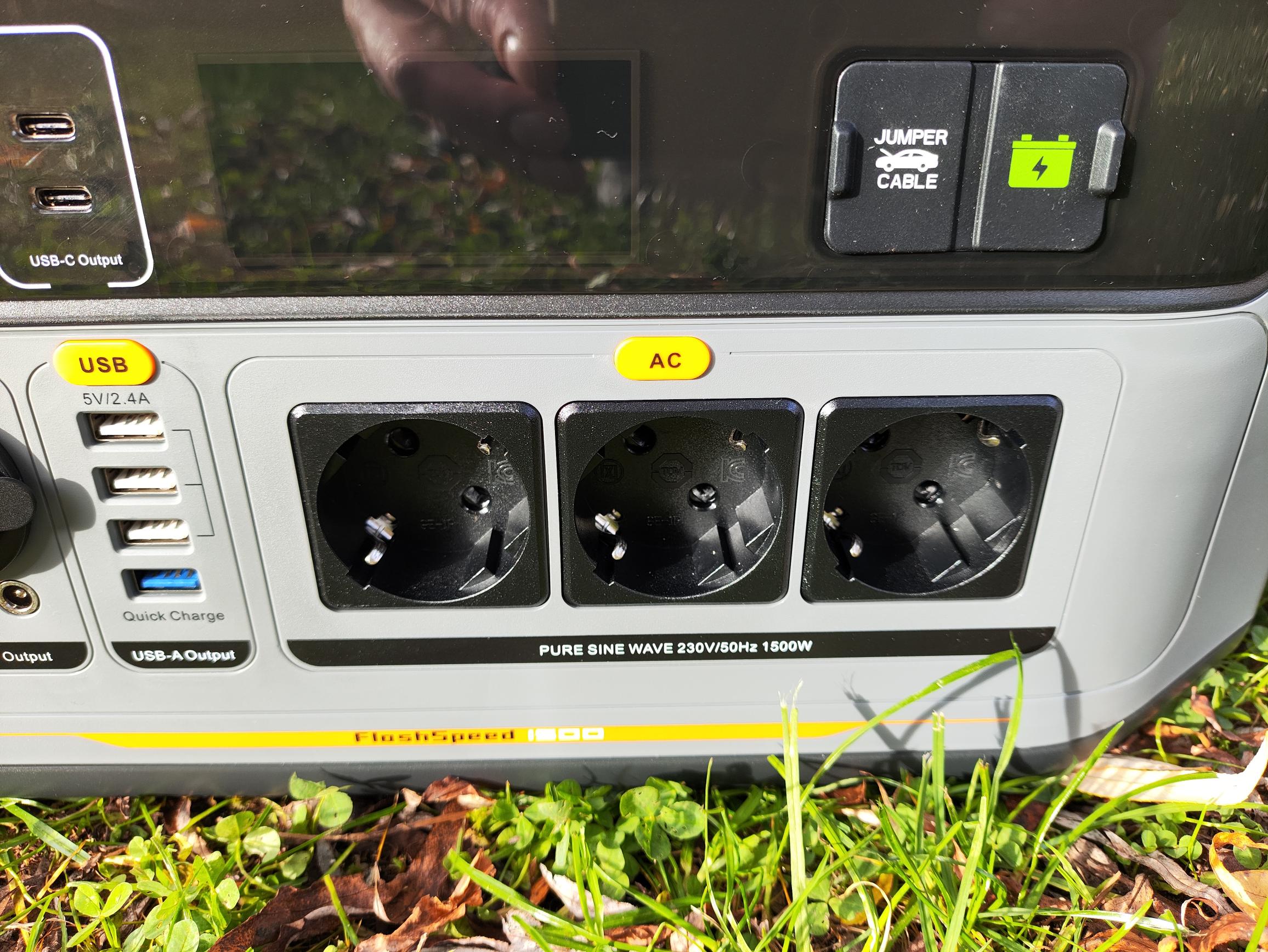 Die drei Wechselstromsteckdosen können eine Dauerleistung von 1.500W bereitstellen und bieten eine Spitzenlast von kurzzeitig 3.000W.