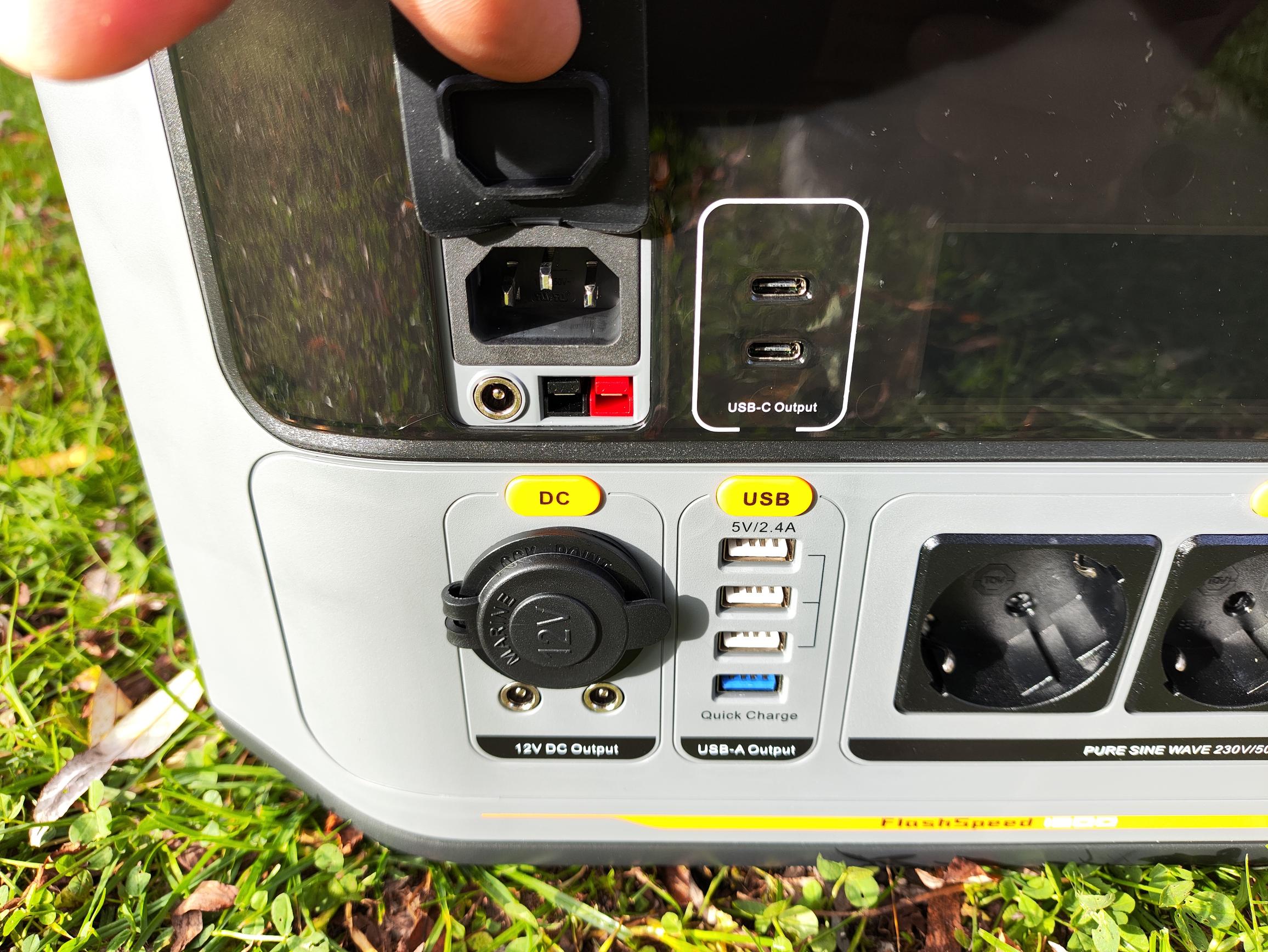 Sämtliche Anschlüsse befinden sich auf der Vorderseite der Powerstation. Somit wird ein Einbau im Wohnmobil oder Camper begünstigt. Auf der linken Seite befindet sich der Luftauslass, für die warme Abluft, während auf der rechten Seite kühle Frischluft angesaugt wird. Auf der Rückseite befindet sich eine LED-Leiste, die sich mittels des danebenliegenden Tasters aktivieren und steuern lässt. Die Helligkeit lässt sich in drei Stufen regeln. Weiterhin stehen ein Blink- und ein SOS-Signal zur Auswahl. Bis auf den Klappmechanismus der Abdeckung, ist die Powerstation hochwertig verarbeitet und optisch gelungen.