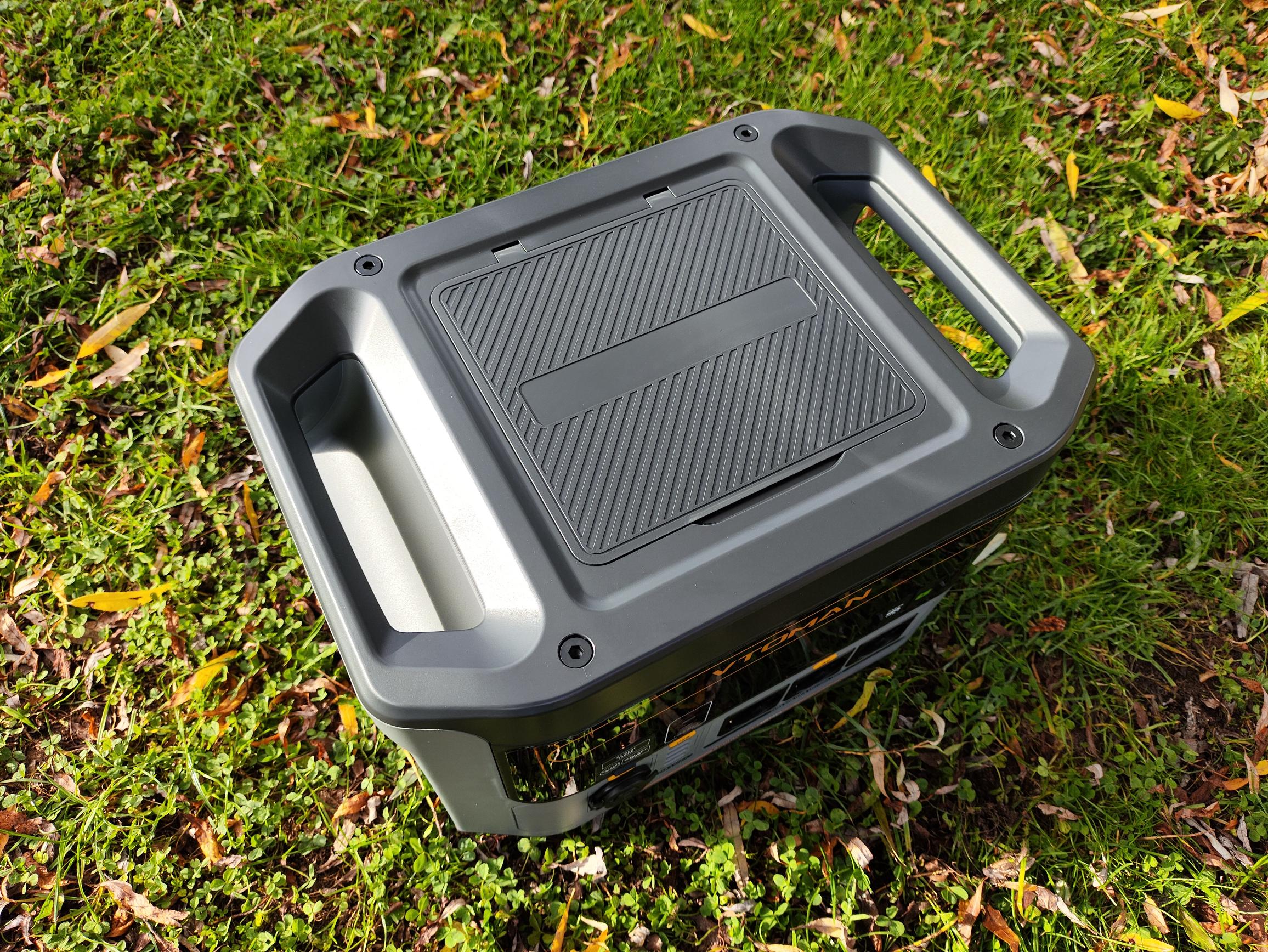 Vom grundlegenden Design gleicht die Vtoman Flashspeed 1500 ihrer kleinen Schwester (Flashspeed 1000) wie ein Ei dem anderen. Das Gehäuse besteht aus einem grauen ABS-Kunststoff, während die Frontpartie mit schwarzen Hochglanz-Akzenten optisch aufgewertet wird. Diese Hochglanzfront ist aber auch ein echter Staubmagnet. Mit Abmessungen von 393 x 280 x 270 Millimeter und einem Gewicht von 18,8 Kilogramm ist die Powerstation zwar kein Leichtgewicht, aber äußerst kompakt in Bezug zur Kapazität. Dank der zwei breiten Tragegriffe und des mittigen Schwerpunktes lässt sich die Vtoman trotz des hohen Gewichtes vergleichsweise einfach transportieren. Das praktische Ablagefach auf der Oberseite ermöglicht es, das Zubehör sicher zu verstauen. Der Klappmechanismus ist allerdings sehr fragil und sollte daher entsprechend vorsichtig geöffnet/geschlossen werden.