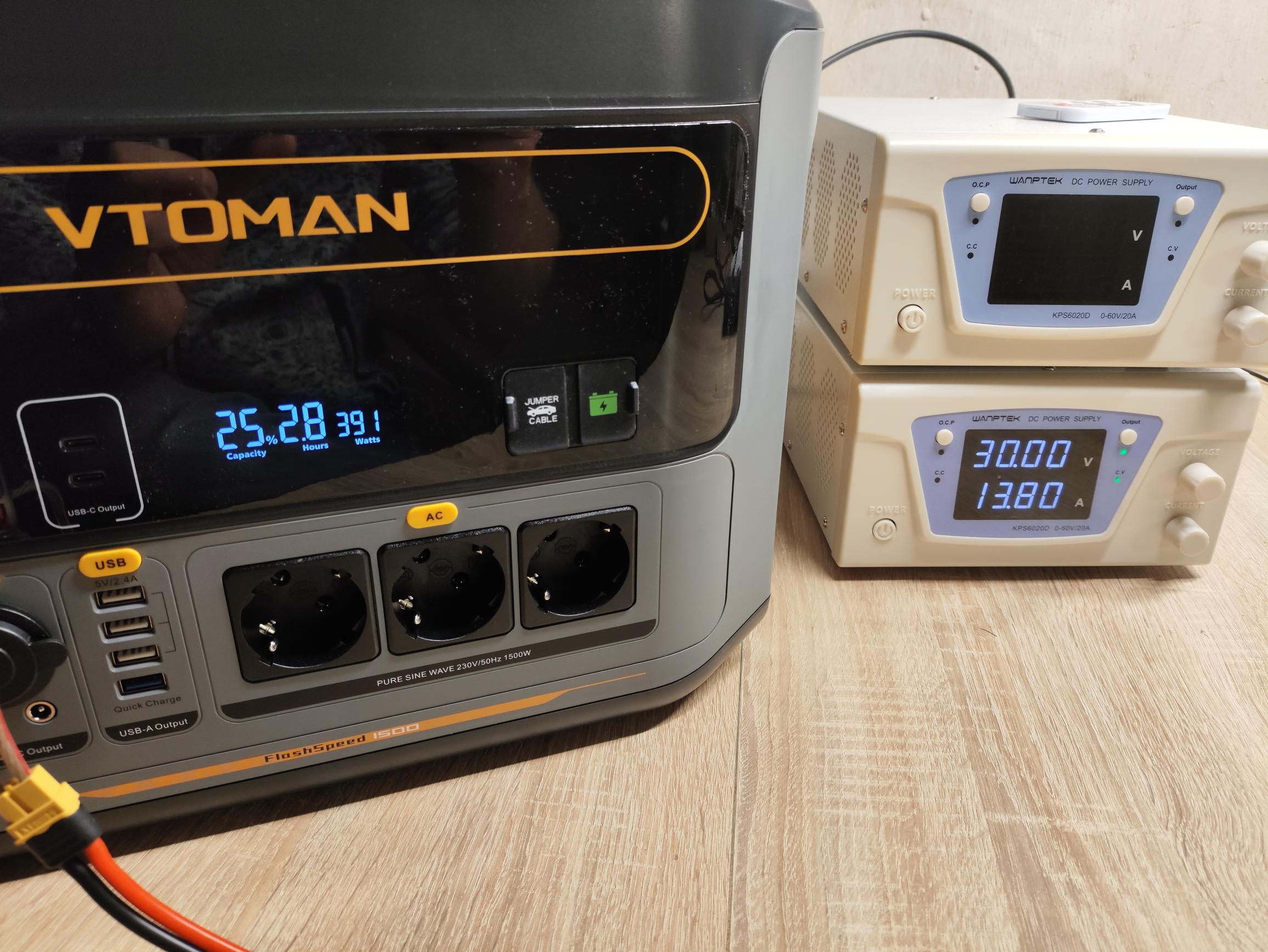 Die Powerstation bietet zwei Ladeeingänge, die den Anschluss von Solarmodulen oder die Ladung im Auto ermöglichen. Der DC5521-Eingang kann eine Spannung von 12-20V verarbeiten, eine Leistung von 200W aufnehmen und begrenzt den Strom auf rund 10A. Dieser ist vornehmlich für die KFZ-Ladung vorgesehen, kann aber auch mit kleinen faltbaren Solarmodulen genutzt werden. Der Anderson-Eingang bietet ein Spannungsniveau von 30-60V kann 400W aufnehmen und ist somit für größere Solarmodule geeignet. An unserem Labornetzteil beginnt dieser bei 29V zu arbeiten und erreicht bereits bei 30V sein Leistungsmaximum. Die maximale Stromaufnahme liegt bei rund 13,8A. Die Vtoman Flashspeed 1500 erlaubt es, die Solar- und AC-Ladung zu kombinieren. Somit stehen bis zu 1.900W Ladeleistung (1.500W AC, 400W Solar) zur Verfügung. Im Test konnte die Powerstation mit dieser Kombination in nur 45 Minuten von 0-100% aufgeladen werden.