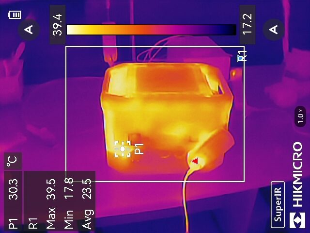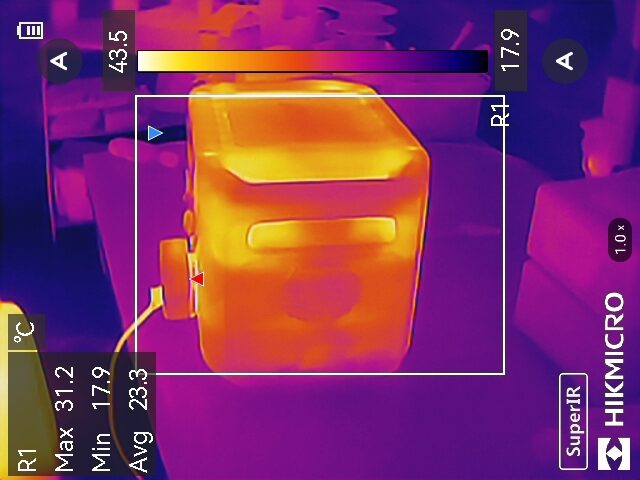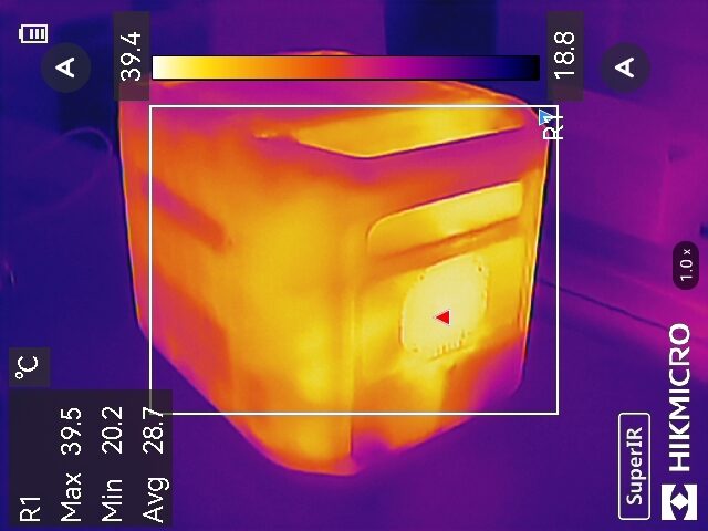 Um eine möglichst hohe Temperaturentwicklung zu realisieren, wurde die Powerstation mit voller Leistung entladen und die Temperaturen kurz vor Erreichen der Entladungsgrenze gemessen.