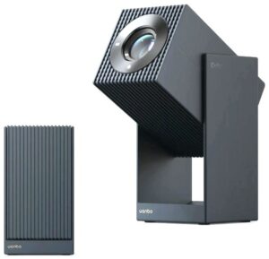Das Design des Wanbo Cube 2 Pro bestimmt vor allem das eckige, streifige Stativ. Der Ständer ist, wie bei der XGIMI MoGo 3- und 4-Reihe, rotierbar, sodass die Linse im Gegensatz zum Wanbo T2 Ultra durch das Gehäuse geschützt ist. Durch das drehbare Design sind sogar Deckenprojektionen möglich. Mit Abmessungen von 113 x 111 x 212 Millimeter und einem Gewicht von 1,4 Kilogramm ist der Beamer recht handlich und lässt sich locker mit einer Hand tragen. Er ist in den Farbvarianten Nachtschwarz, Beigegrün und Weiß erhältlich. Im Werbevideo präsentiert Wanbo zwei weitere Farben, die (noch) nicht bestellbar sind: Orange und Pink.